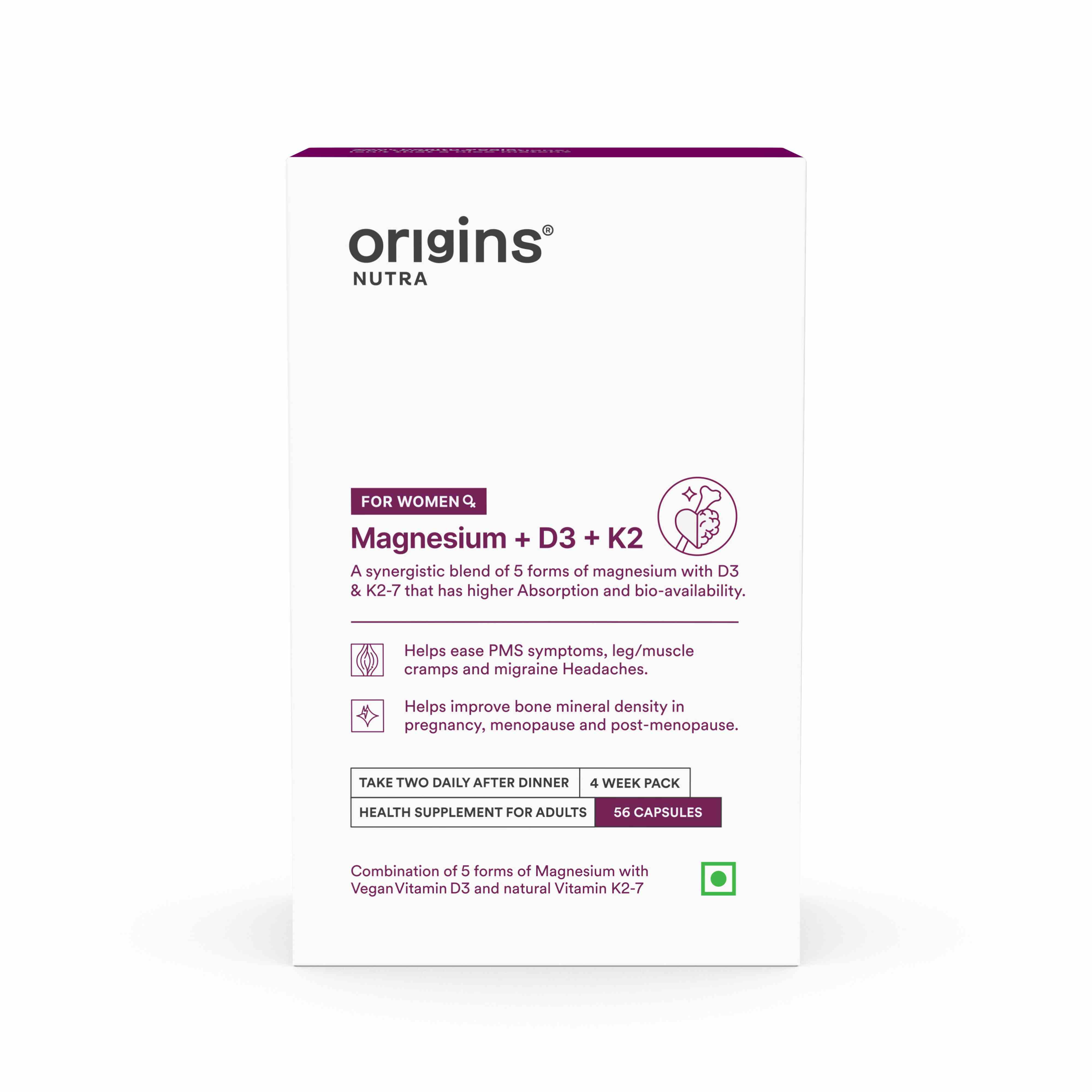Origins Nutra | Magnesium + D3 + K2-7 for Women | 56 Veg Cap (Pack of 1)
