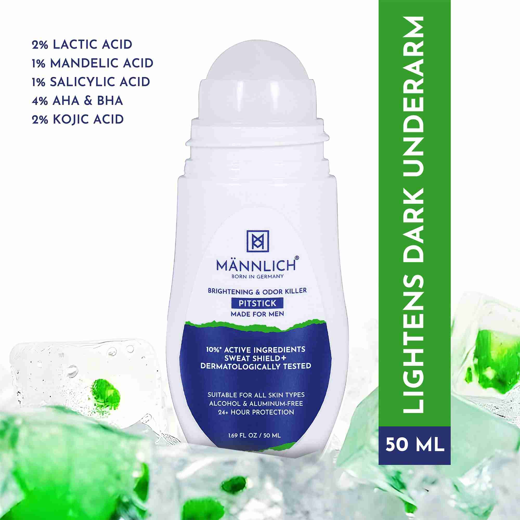 Mannlich | Underarm Roll On for Men | 2% Kojic & Lactic Acid, 4% AHA & BHA, Fades Dark Spots Deodorant Roll-on | For Men | 50ml