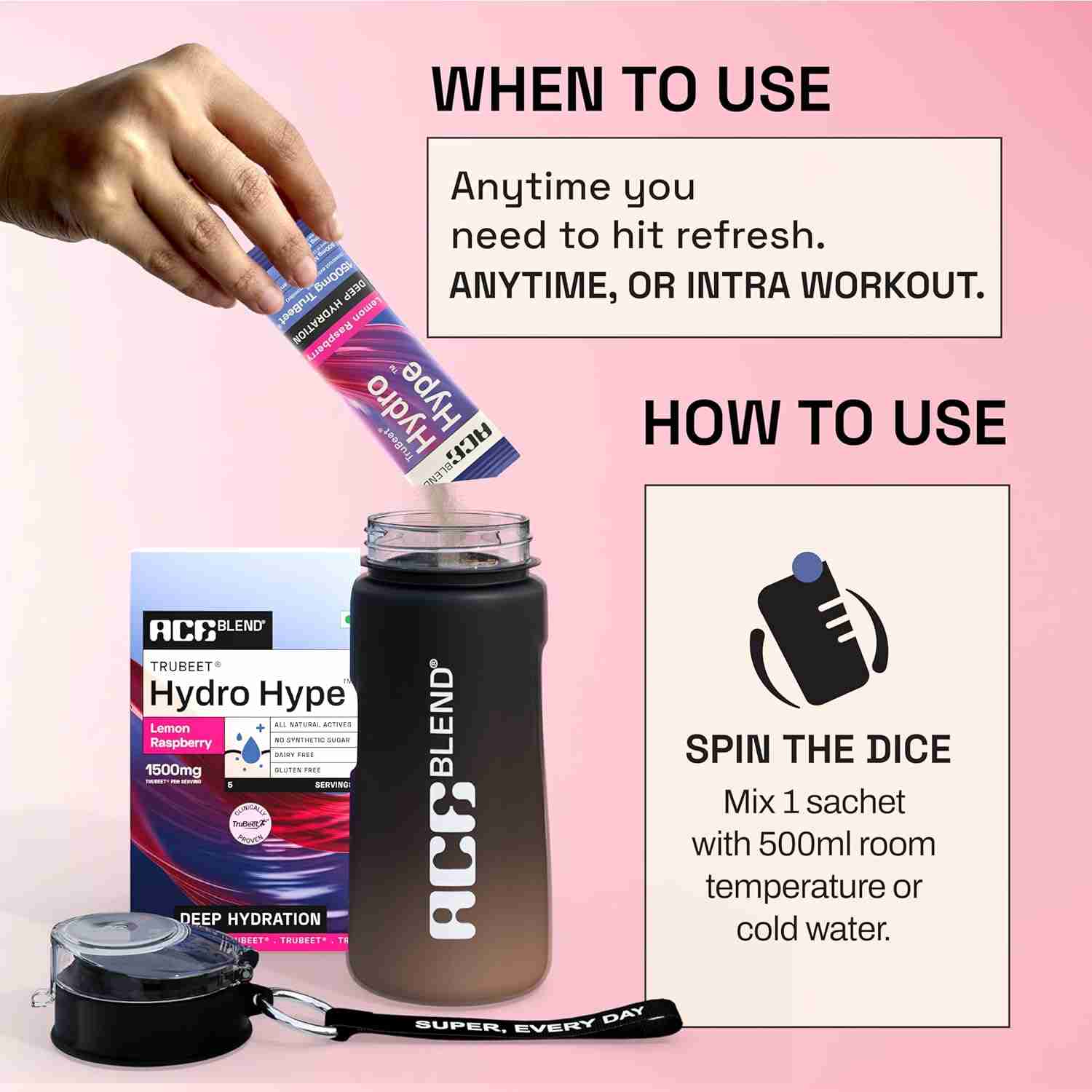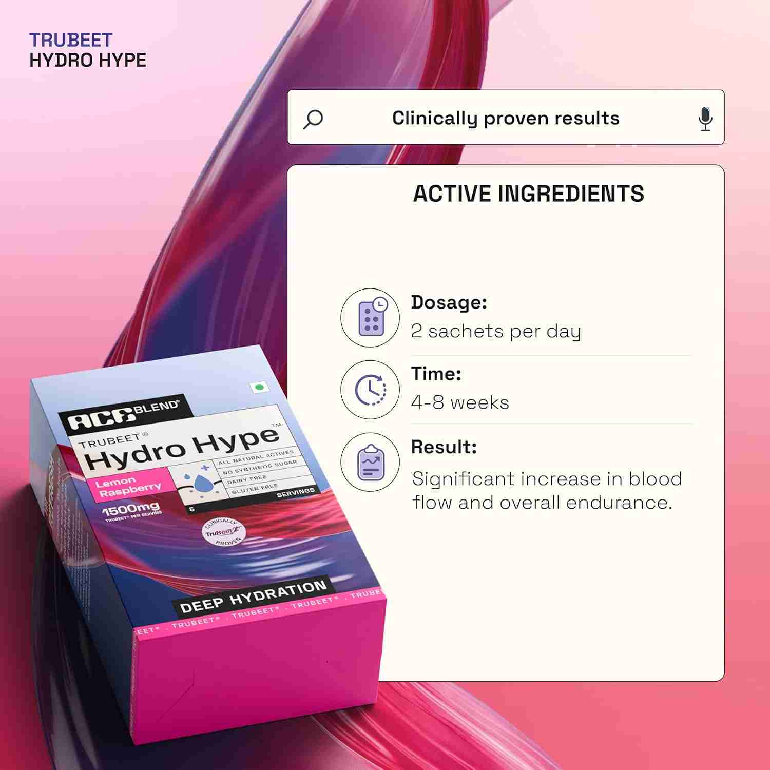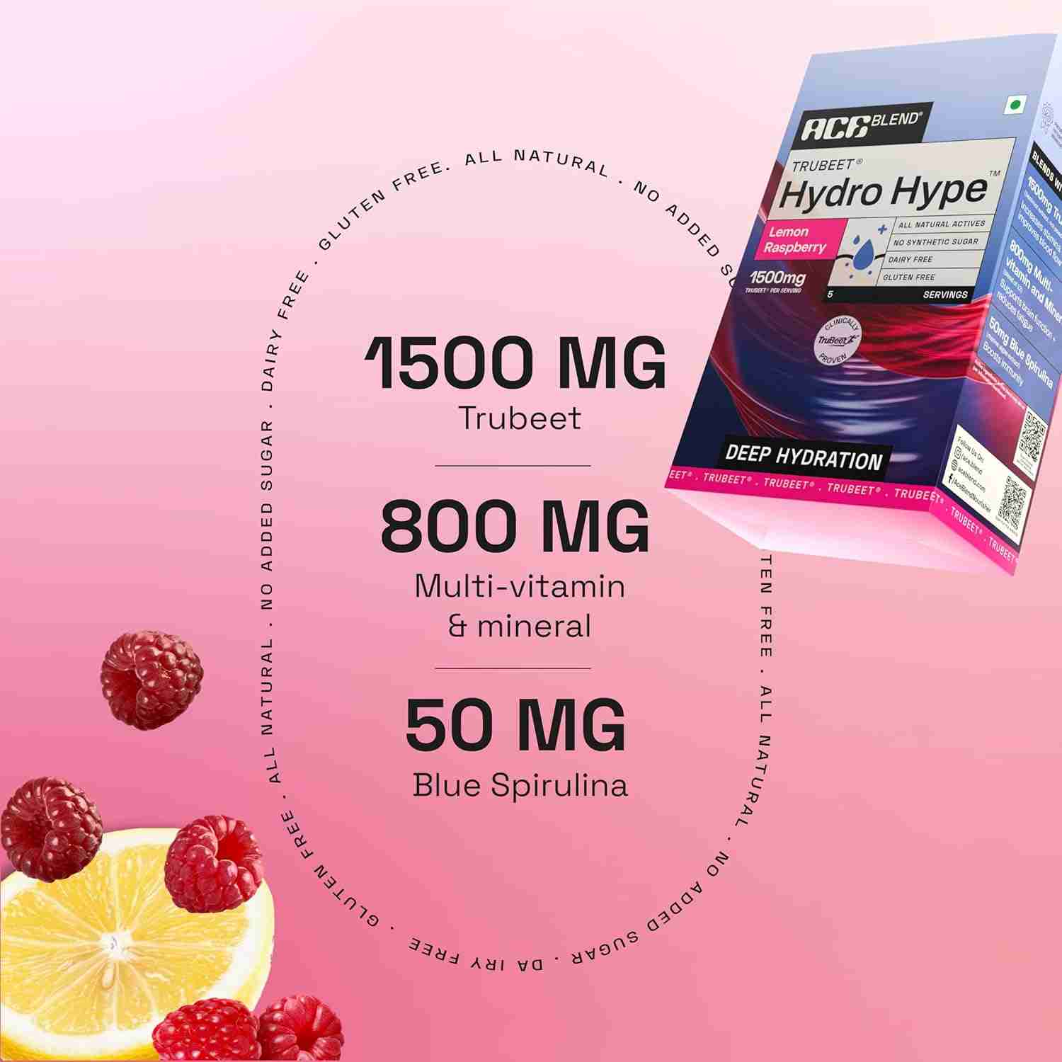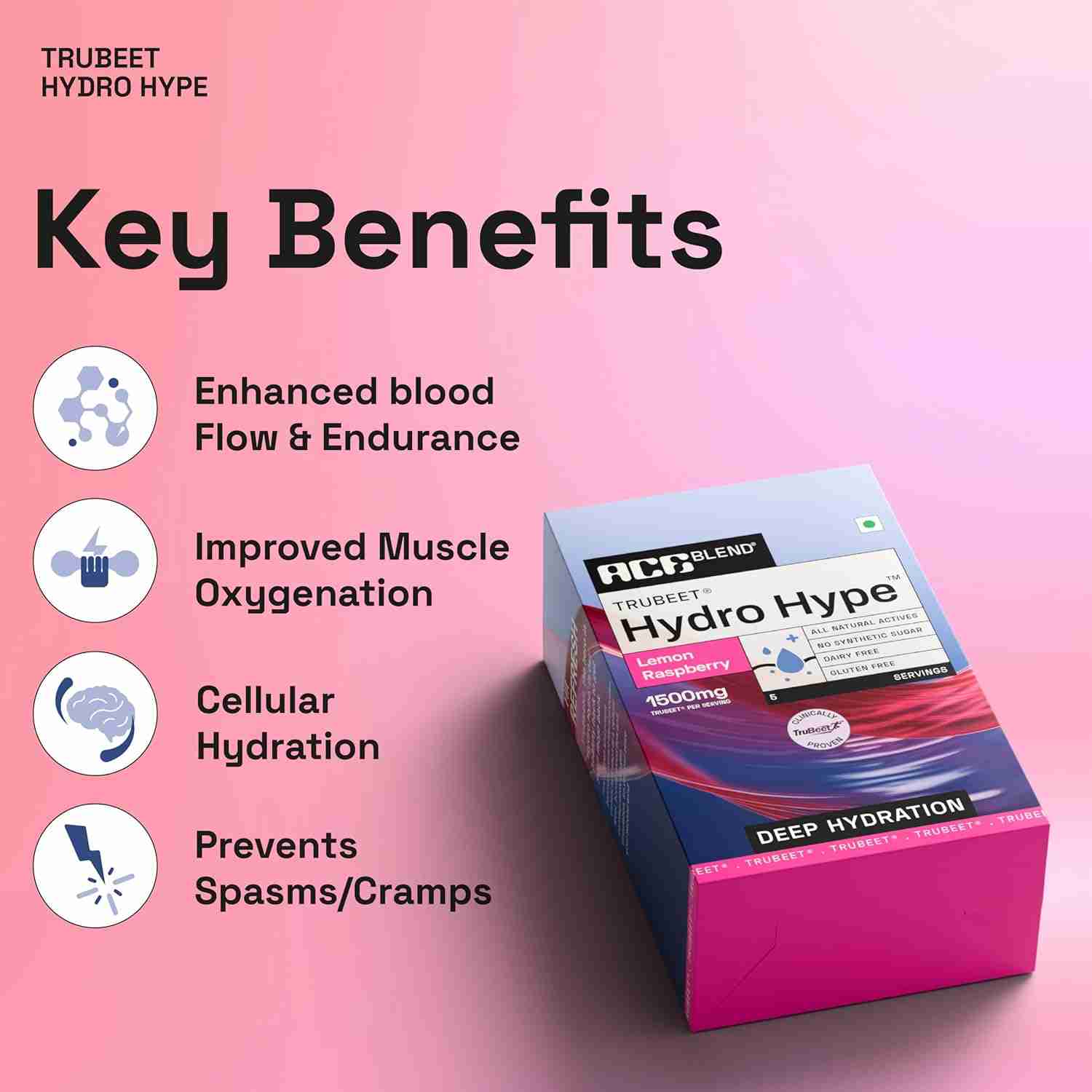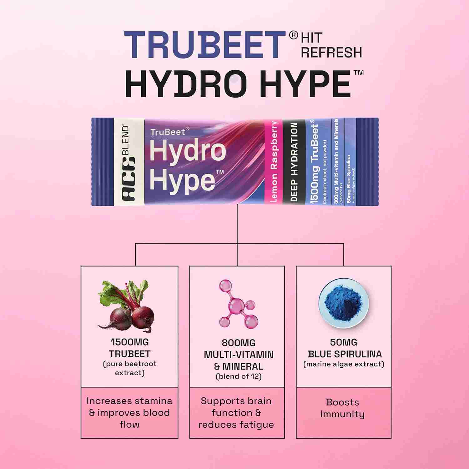 Ace Blend Trubeet Hydro Hype Deep Hydration Nutraceutical Powder is a nitrate-infused hydration drink containing TruBeet®, electrolytes, minerals, and Blue Spirulina to support blood flow, endurance, and deep hydration during physical activity.