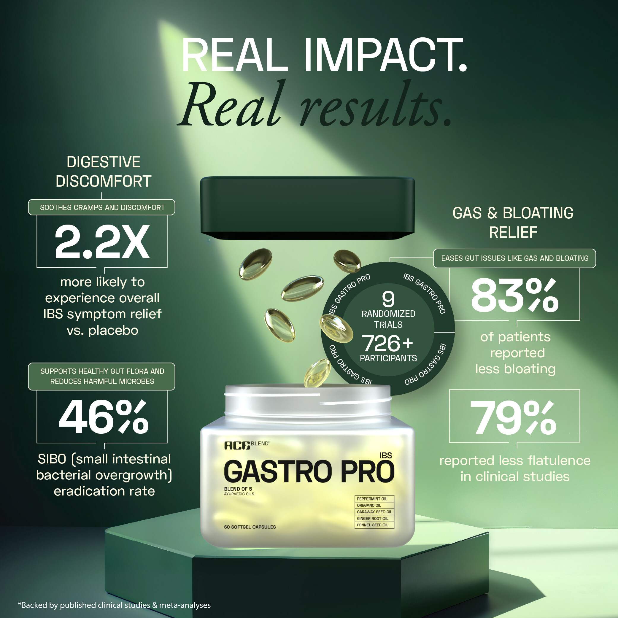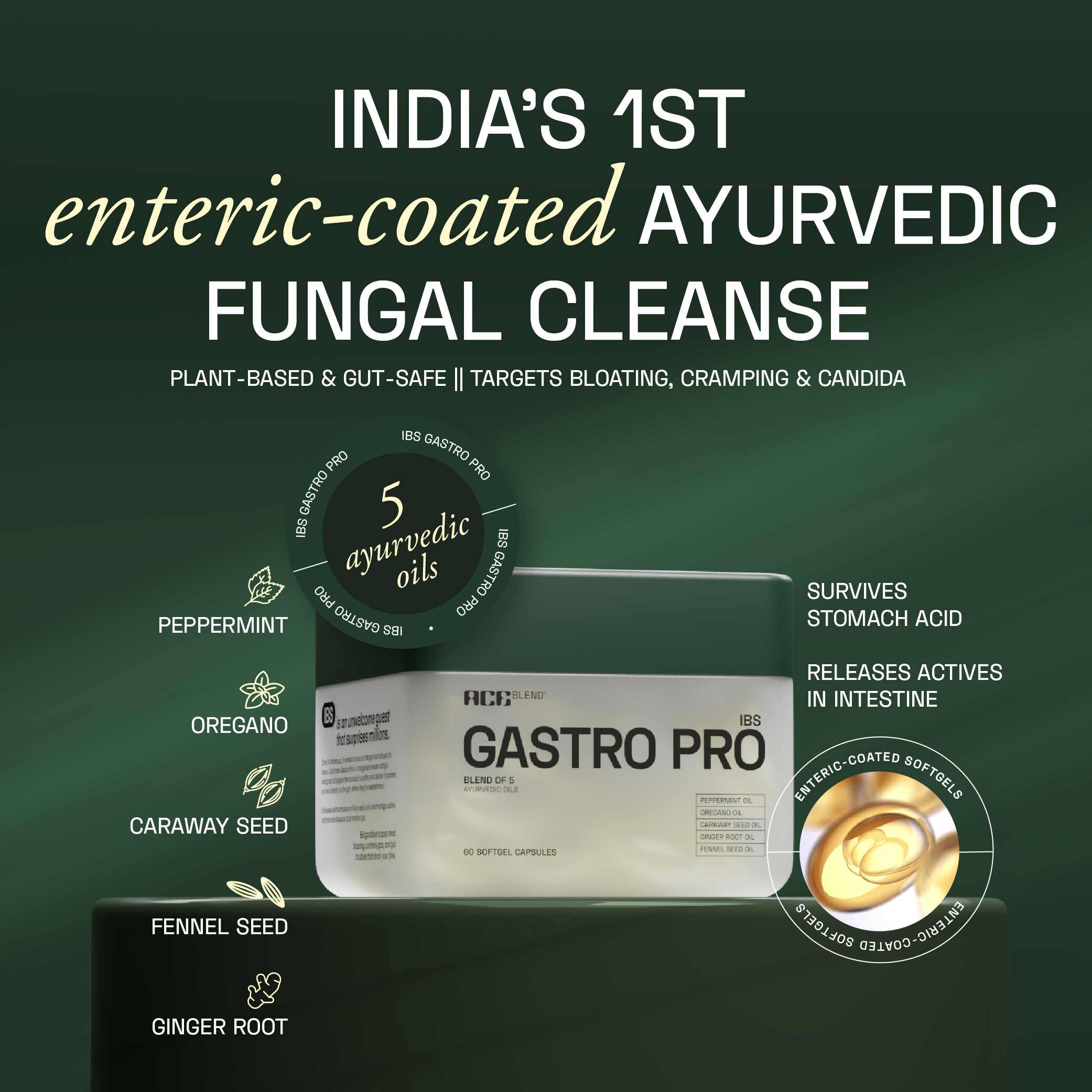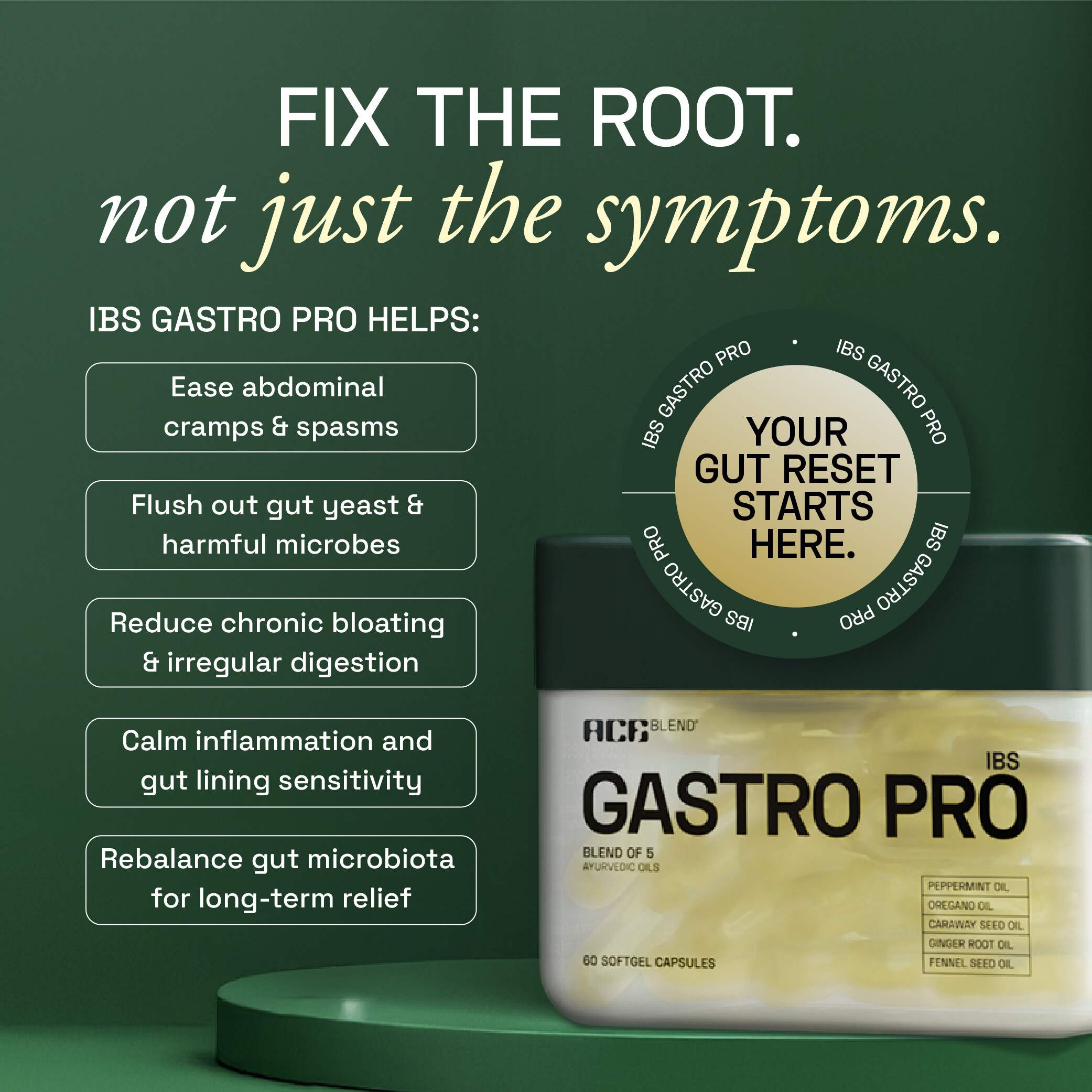 Ace Blend IBS Gastro Pro Softgel Capsule is an Ayurvedic digestive support formula made with five potent herbal oils to help relieve IBS symptoms, bloating, gas, and improve gut comfort.