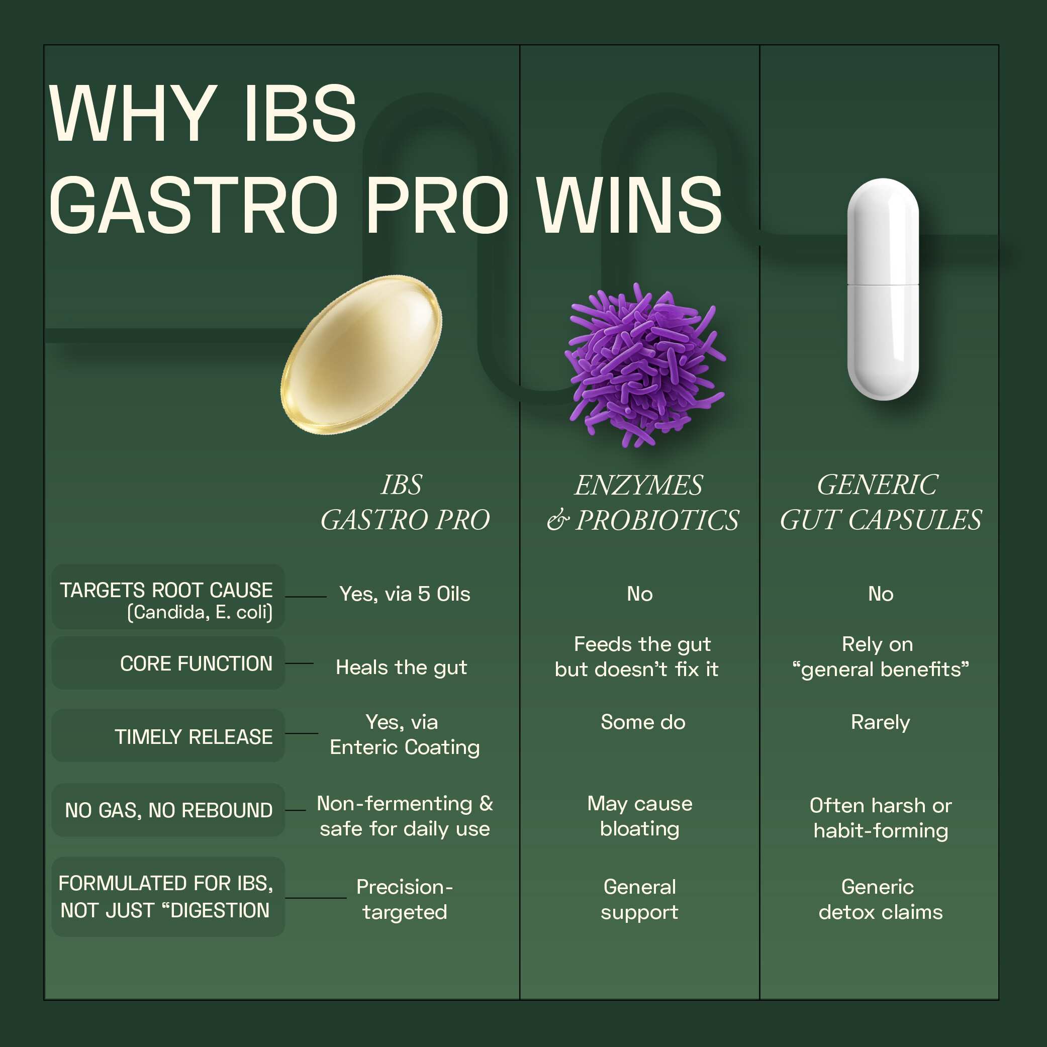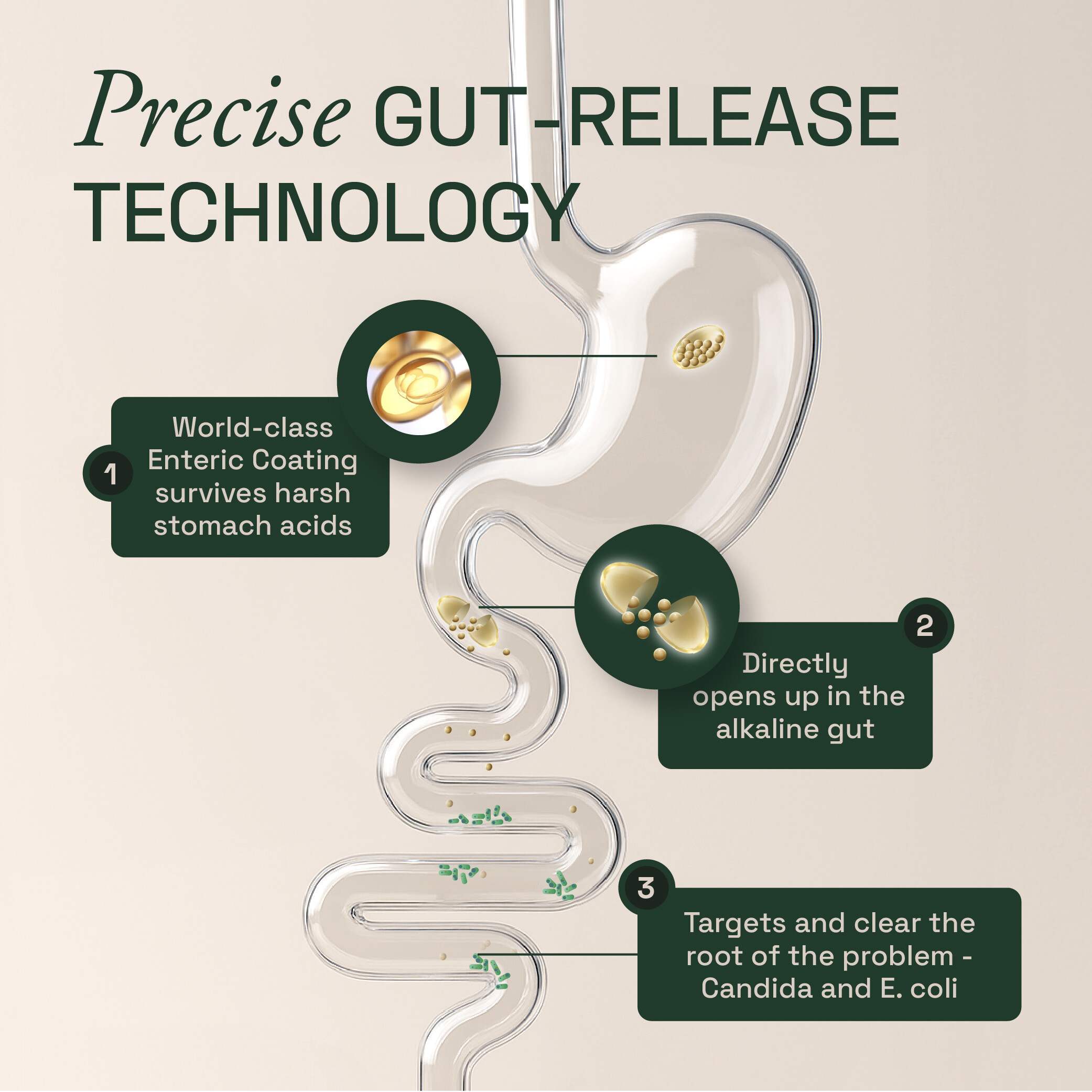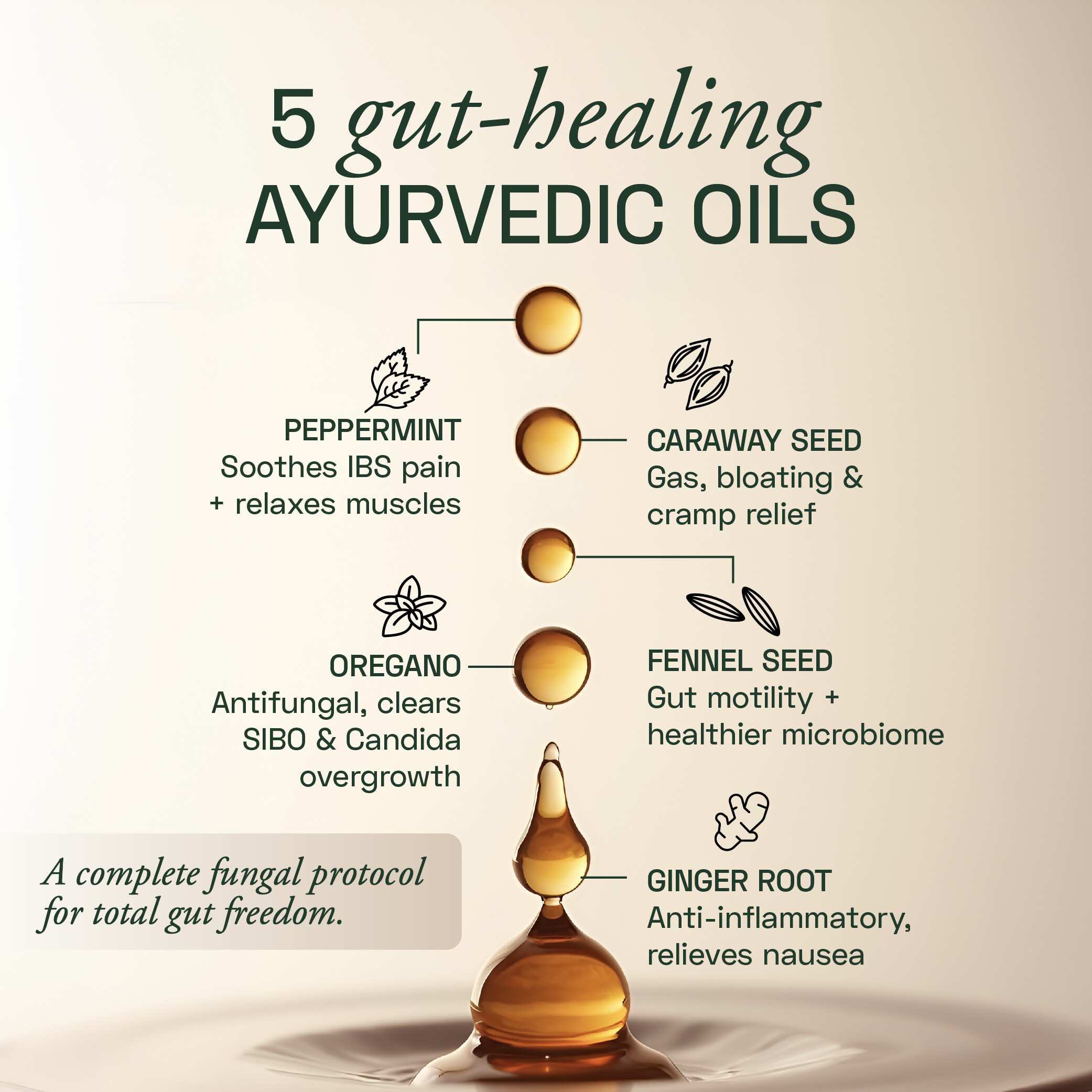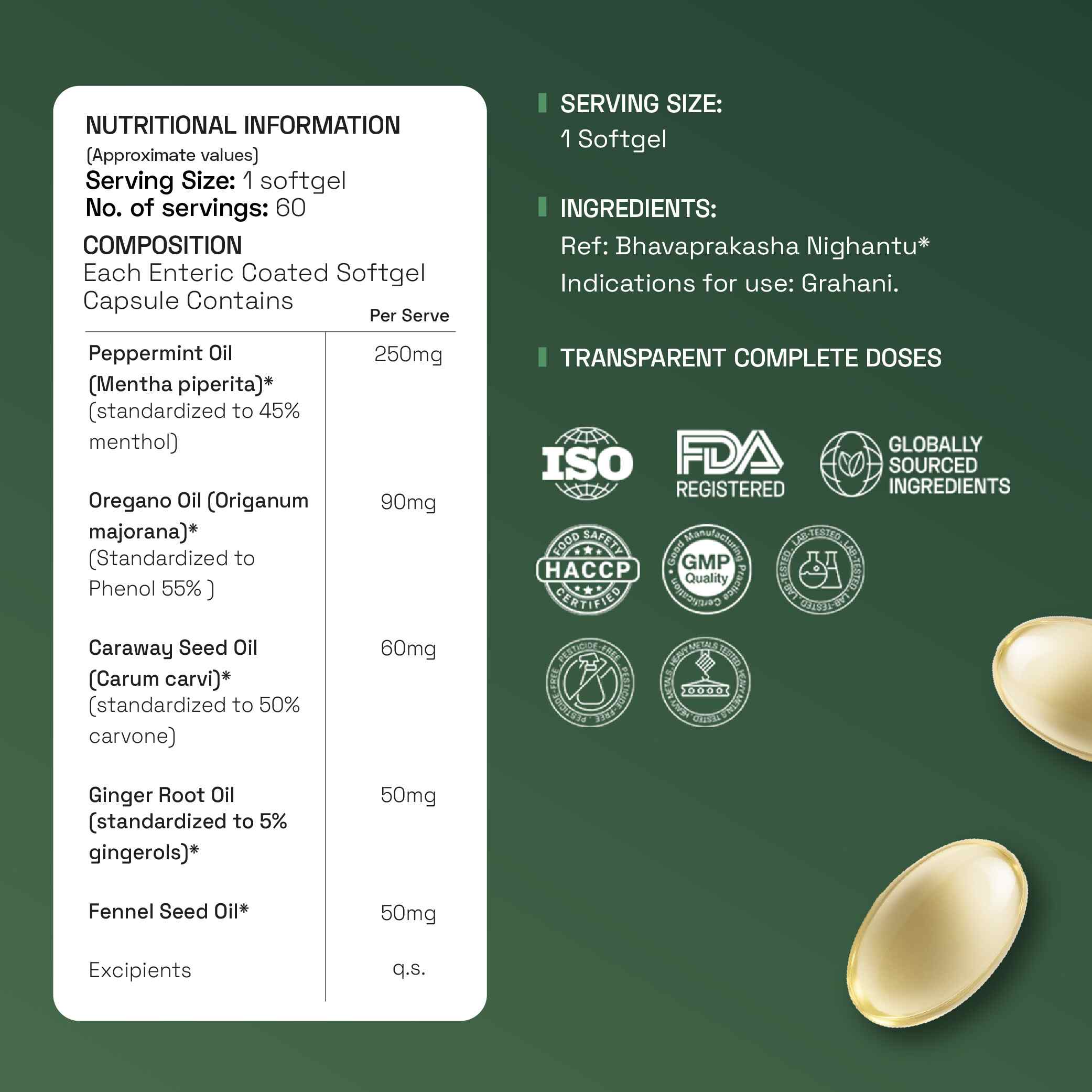 The softgel combines soothing, antifungal, anti-inflammatory, and motility-enhancing oils that collectively ease IBS discomfort, reduce bloating, and support gut balance.