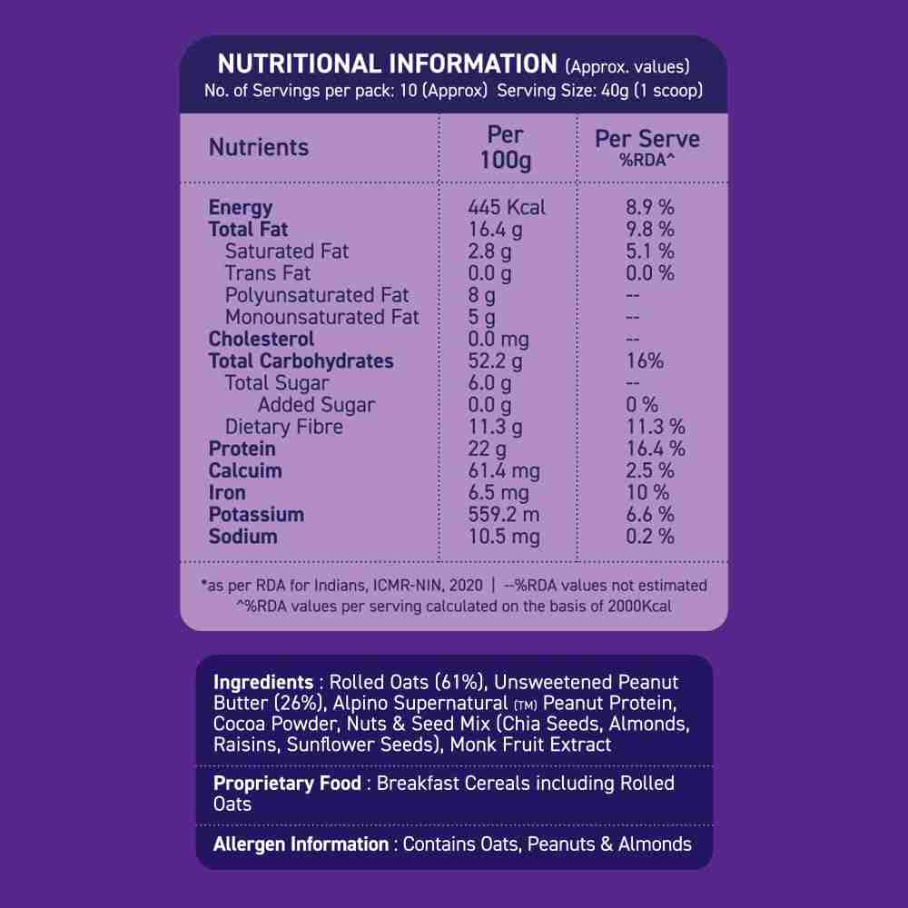 • Key Ingredients : Rolled Oats(61%), Unsweetened Peanut Butter(22%), Cocoa Powder, Textured Soya Protein(9%), Nuts & Seeds Mix(Almond, raisin, Sunflower Seeds), Munk Fruit Extract, Rosemary Extract