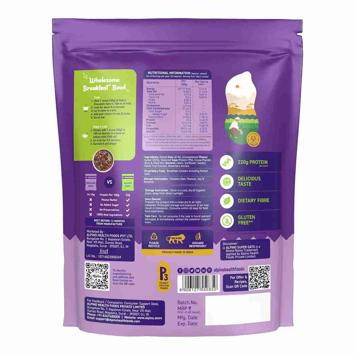 Fuel your day with the wholesome goodness of ALPINO High Protein Super Oats Chocolate. This product combines the power of rolled oats, natural peanut butter, rich cocoa powder, and a blend of nuts and seeds, delivering a delicious and nutritious breakfast or snack. With 22% protein, this super oats mix supports your active lifestyle while providing essential dietary fibre and healthy fats.