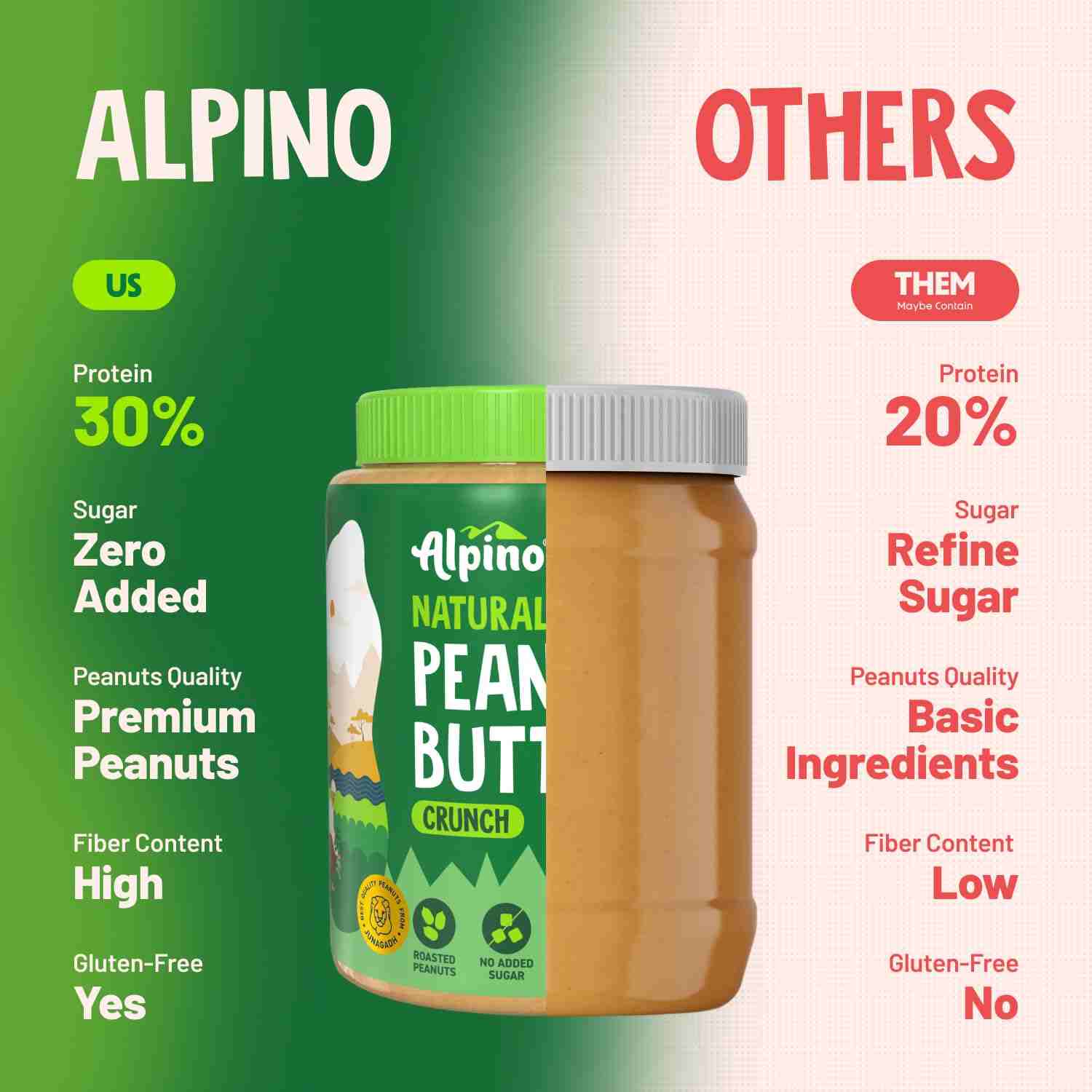 Discover the pure, natural goodness of ALPINO Natural Peanut Butter, crafted with just one ingredient: 100% roasted peanuts. This product is packed with 30% protein, making it an excellent choice for fitness enthusiasts and health-conscious individuals. We believe in keeping it simple and healthy, which is why our peanut butter is free from added sugar, salt, and hydrogenated oils. It's naturally gluten-free, non-GMO, and perfectly suited for a plant-based diet.