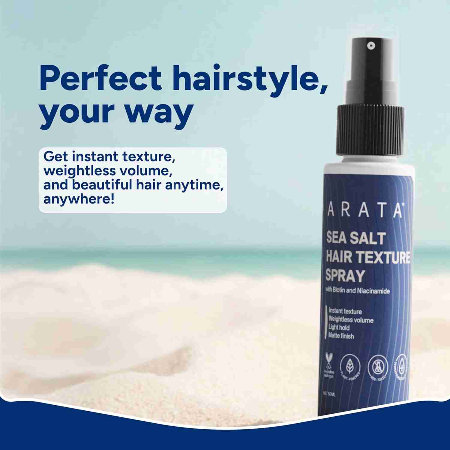 Arata Sea Salt Hair Texture Spray is water-based and contains no alcohol, sulphates, or parabens.