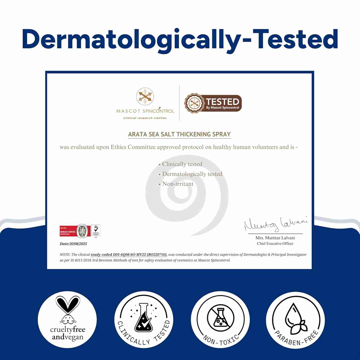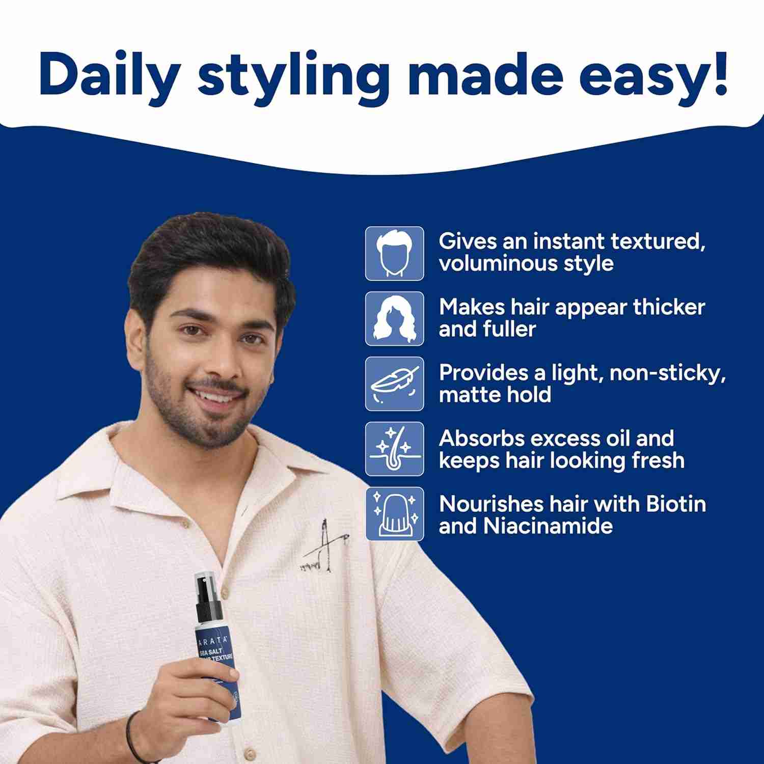 Product type: Hair texture spray. Net quantity: 1 unit consists of 50ml hair texture spray. Shelf life: 18 months from the date of manufacturing. Country of origin: India. Manufactured by: Bo International Private Limited, 884, Udyog Vihar, Phase 5, Gurgaon, Haryana, 122016. Marketed by: Slick Organics (P) Ltd., D-1, 1st Floor, Local Shopping Centre, Soami Nagar, New Delhi, 110017, India. Consumer Support: info@arata.in / 1800 103 5572 (Monday–Friday, 10am–5pm).