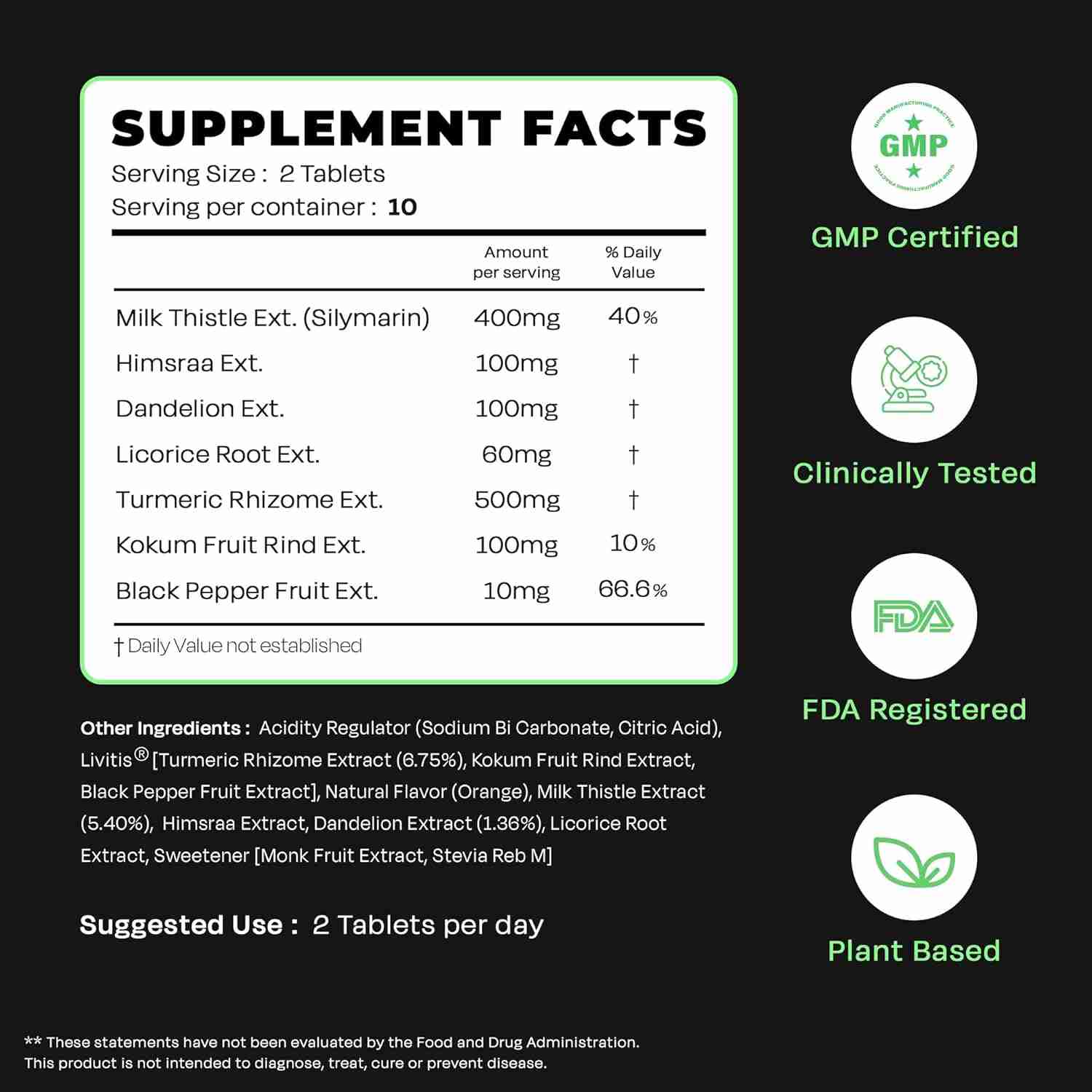 • Key Ingredients : Acidity Regulator (Sodium Bi Carbonate, Citric Acid), Livitis [Turmeric Rhizome Extract (6.75%), Kokum Fruit Rind Extract, Black Pepper Fruit Extract], Natural Flavor (Orange), Milk Thistle Extract (5.40%), Himsraa Extract, Dandelion Extract (1.36%), Licorice Root Extract, Sweetener [Monk Fruit Extract, SteviaReb M]