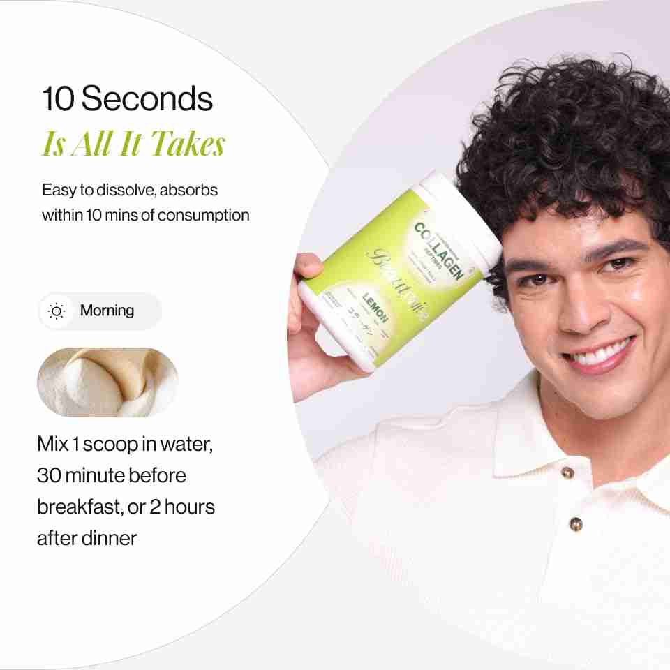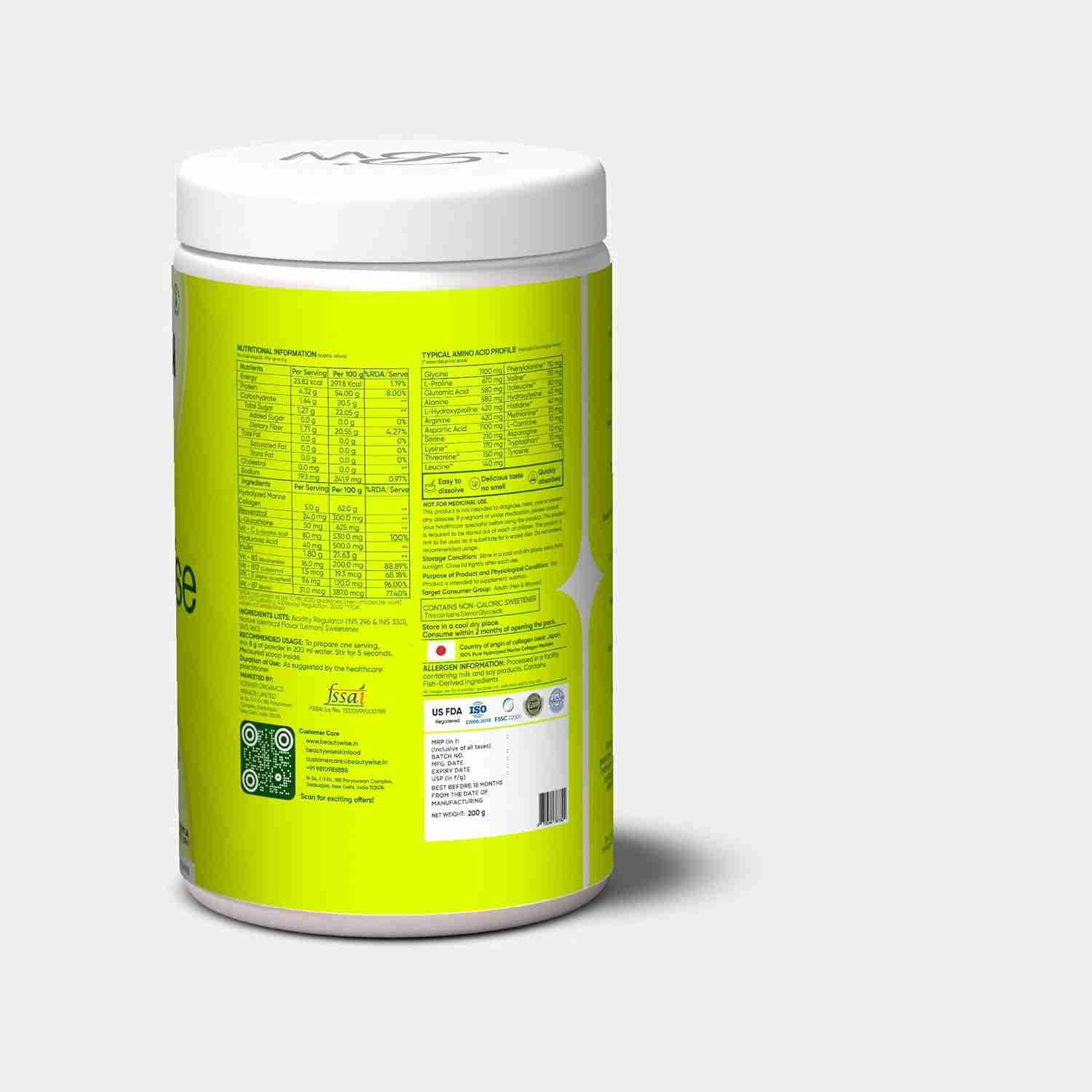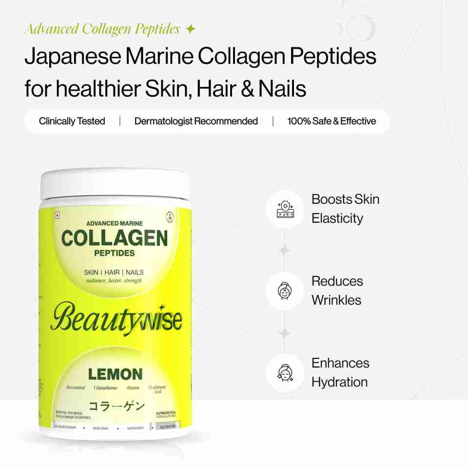 • Key Benefits : PREMIUM JAPANESE MARINE COLLAGEN PEPTIDES FOR A RADIANT GLOW: With Beautywise Advanced Marine Collagen, you receive the highest grade of 100% pure and natural clinically tested collagen from Japan. Each serving provides premium 8000 MG (per serving) of the skin supplement - the building blocks to regenerate and renew firm, beautiful, hydrated, and youthful skin. Our Pure Collagen with Type 1 & 3 peptides is hydrolyzed to a very low molecular weight for optimal bioavailability and solubility. YOUR PATH TO YOUTHFUL RADIANCE: Collagen production declines as we get older (starting as early as your 20s), resulting in dry and blemished skin and damaged hair. A delicious serving includes clinically tested collagen along with super ingredients like Glutathione, Resveratrol, Hyaluronic Acid, and Vitamin C to help nourish your skin, restore skin radiance and increase skin luminosity. Not only does increasing collagen levels help your skin look firmer, smoother, and more youthful, but it also helps prevent hair fall. DERMATOLOGIST RECOMMENDED FORMULA: Our formula features a blend of potent antioxidants and vitamins, including Glutathione, Resveratrol, and Vitamin C. These ingredients work synergistically to restore skin radiance and efficiently prevent the aging process. Dermatologist across India and Dubai recommend Beautywise Collagen to improve skin luminosity, and skin elasticity. COMPLETE ANTIOXIDANT DEFENSE FOR YOUR SKIN: Resveratrol helps hydrate skin to prevent dryness and strengthen natural barriers, making it smoother and healthier. It effectively combats the damaging effect of free radicals that lead to skin aging. Ingredients like Hyaluronic Acid and Vitamin C help reduce inflammation and minimize signs of skin damage by fighting free radicals caused by air pollution and UV rays, promoting healthy skin. ILLUMINATE YOUR SKIN WITH RADIANCE: L-Glutathione, also known as the master antioxidant, tackles skin-damaging free radicals and reduces inflammation, clearing scars and spots on your skin to give that bright, youthful glow. It inhibits melanin production by converting the eumelanin pigment (responsible for dark spots) into pheomelanin, which provides luminosity and clarity to the skin. Enjoy a radiant and glowing complexion with regular use. HOW TO CONSUME: Mix one scoop of Advanced Marine Collagen into 200 ml of water or your favourite beverage daily. Stir for 5 secs and consume immediately. Use consistently for 12 weeks for best results.