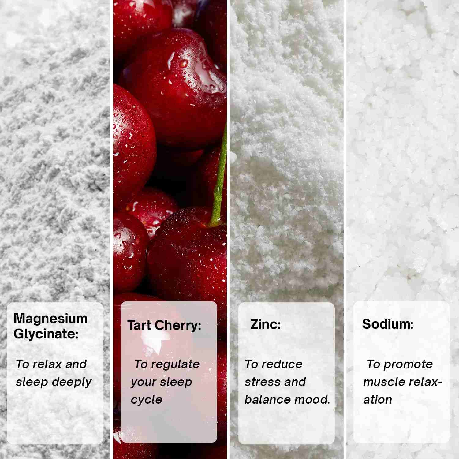 • Key Ingredients : Magnesium Glycinate "Eq. to Elemental Magnesium", Zinc, Sodium, Tart Cherry (Prunus Cerasoides)
