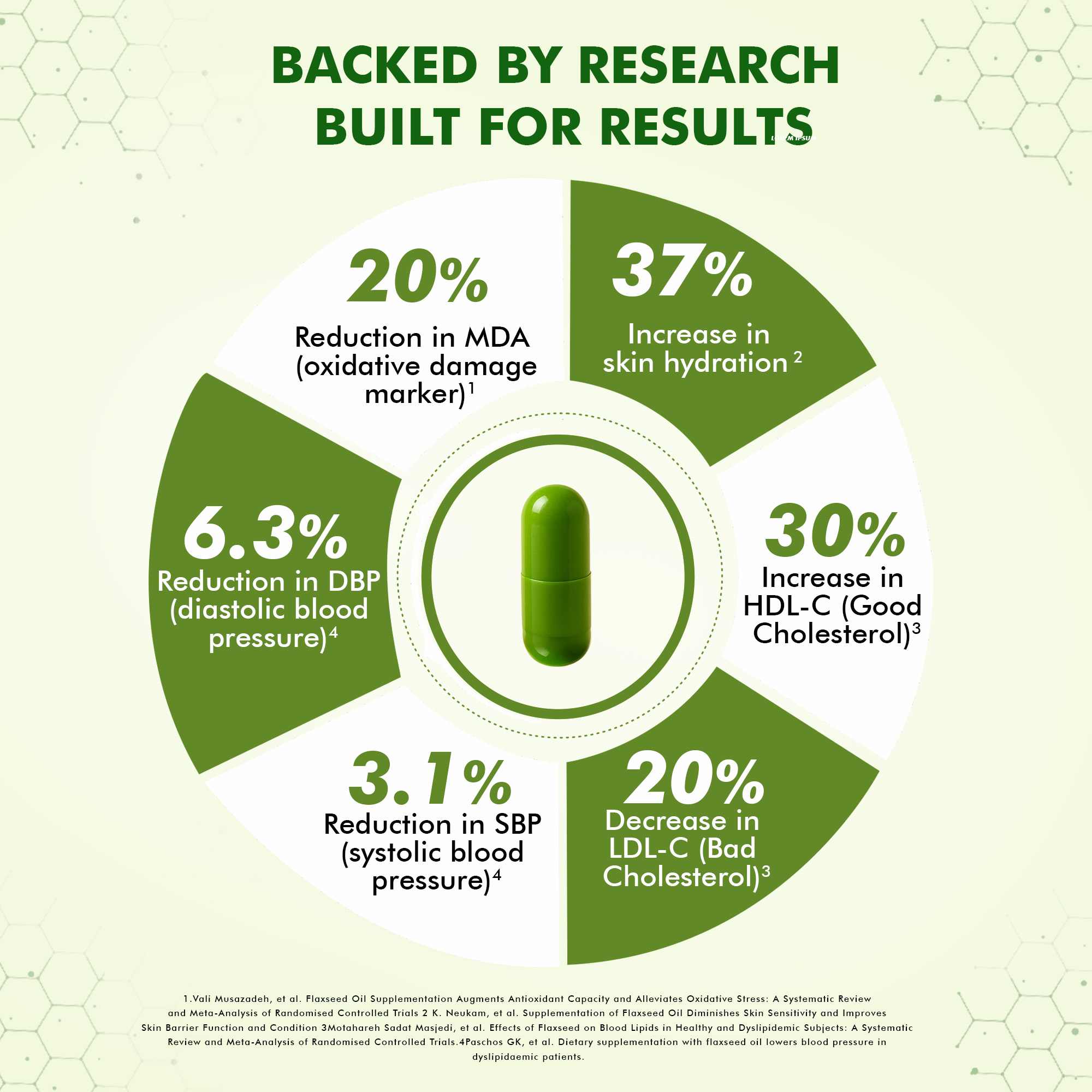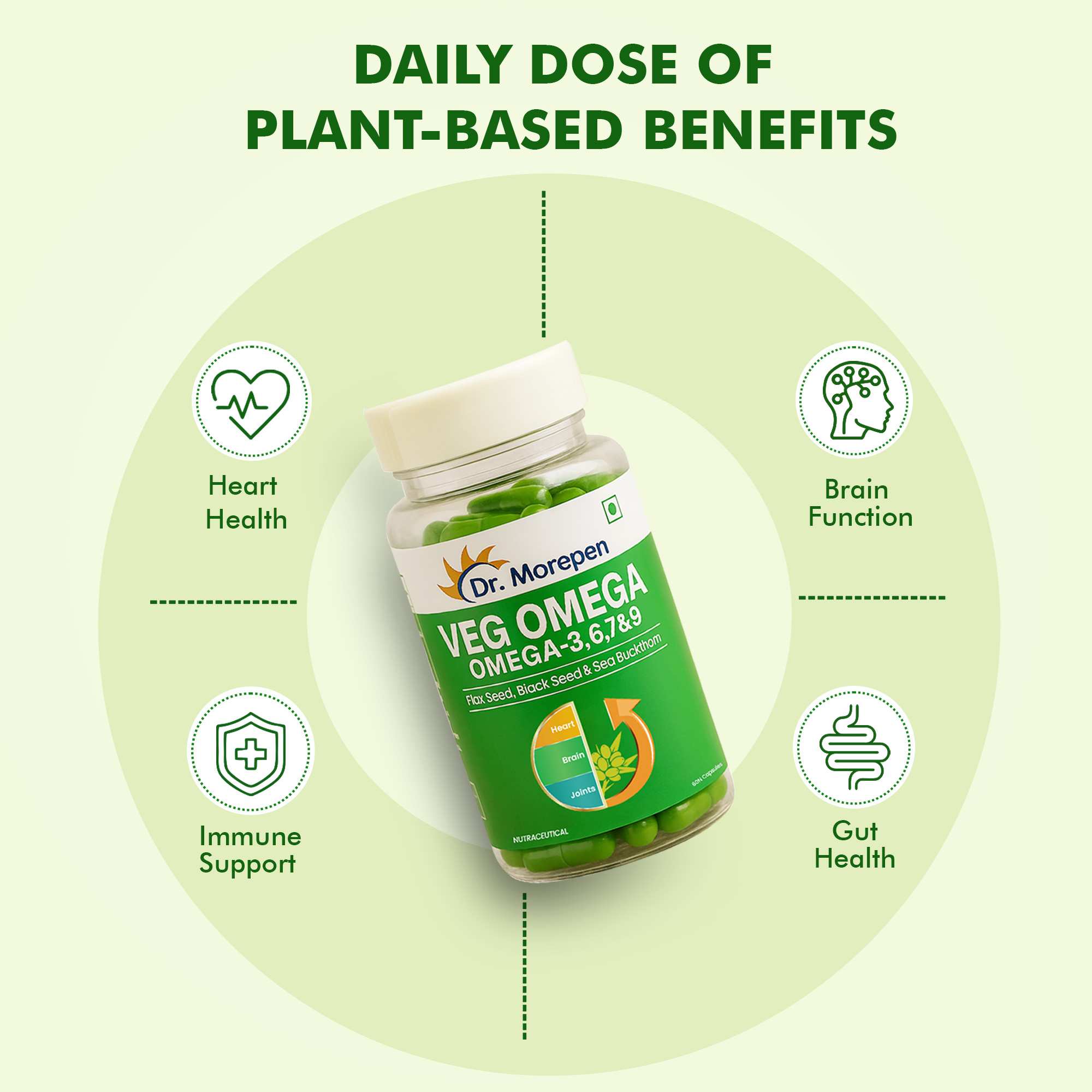 Dr. Morepen brings to you, a 100% vegetarian way to provide you a perfectly balanced Omega-3, 6, 7 & 9 for a healthy heart, sound brain function, metabolism, improved bones and joints health. This unique combination of 4 types of Omegas has been prepared from Omega-3 from Flax Seeds, Omega-7 from Sea Buckthorn and Omega-9 & 6 derived from Black Seeds to create a supplement that is super rich with Omega-3-6-7-9. It is made sustainably and ethically to deliver our bodies pure Omegas directly from the magic of plants. These are safe and natural capsules - free of Additives, Flavours, Heavy Metals or any Preservatives. Story Behind Indian Diet & Omegas Omega-3 and Omega-6 are two major fatty acids that promotes overall well-being of human body, if taken in a balanced proportion. Omega-6 rich diets promote inflammation whereas Omega-3 diets are anti-inflammatory. Most Indian diets have a higher amount of Omega-6 as compared to Omega-3. This is because most vegetarian foods and oils used for cooking, fruits, vegetables and nuts are common in the Indian diet. Omega 3 rich sources, such as seafood and flaxseed are not a part of regular Indian foods. Such imbalance usually leads to heart diseases, obesity and diabetes. How much Omega’s you get by consuming 1 Capsule? Here’s your daily dose of 500mg Omega’s = FLAX SEED 250MG + BLACK SEED 150MG + SEA BUCKTHORN 100MG Now get the advantage of 4 Balanced Omegas in a single capsule every day!