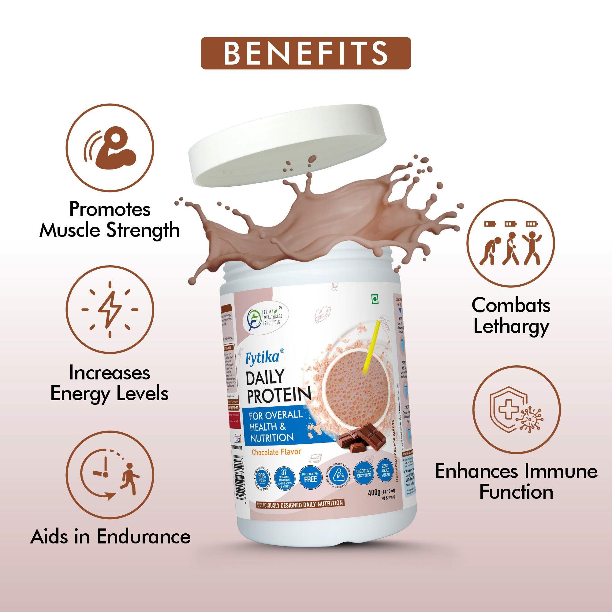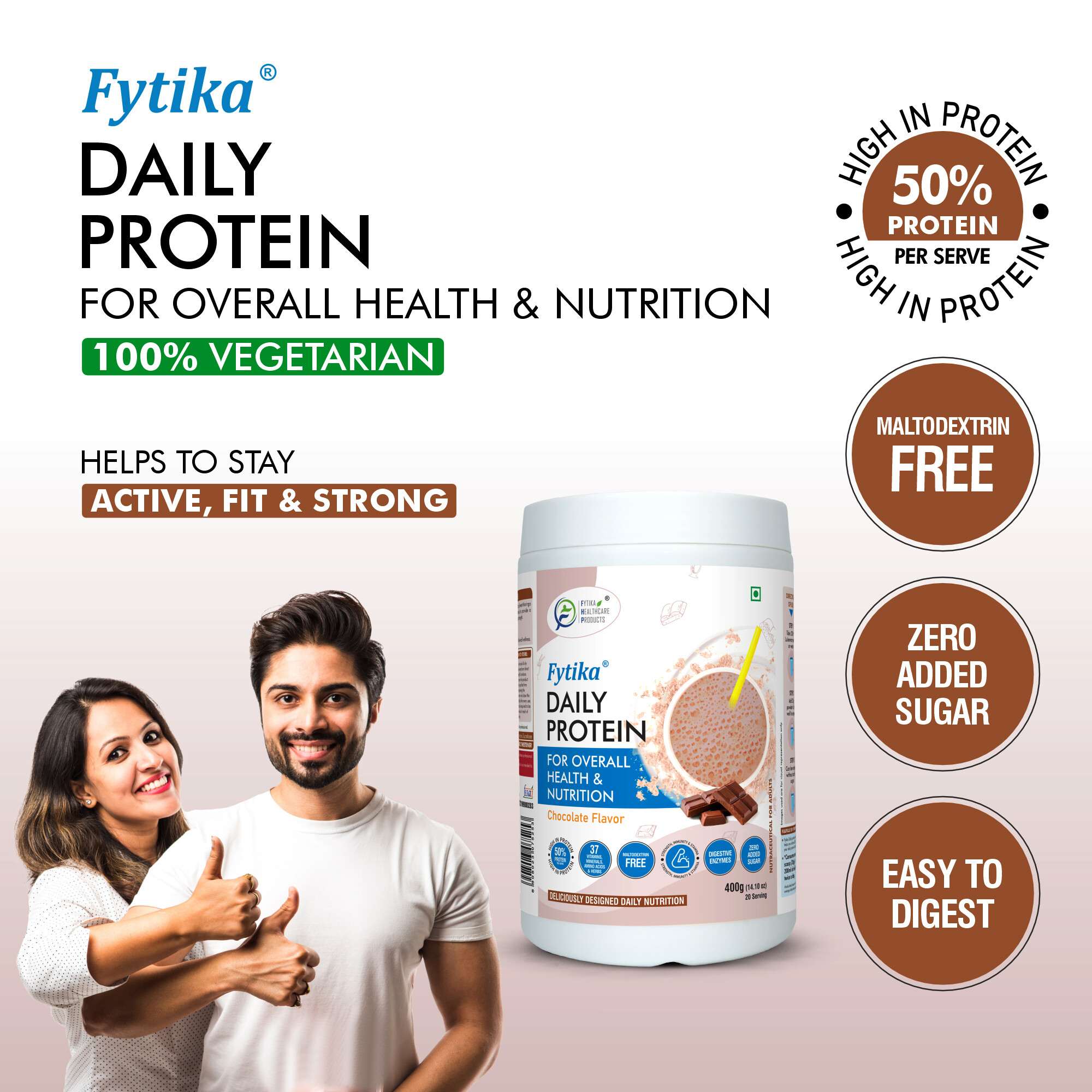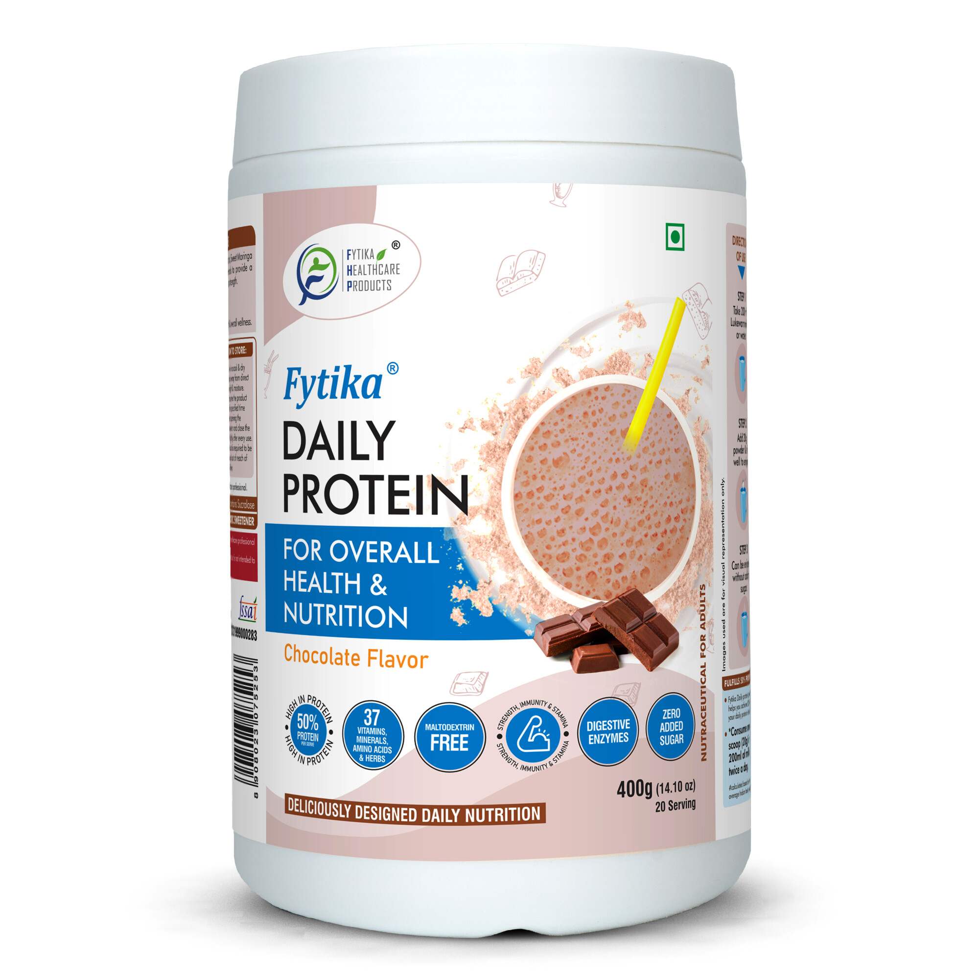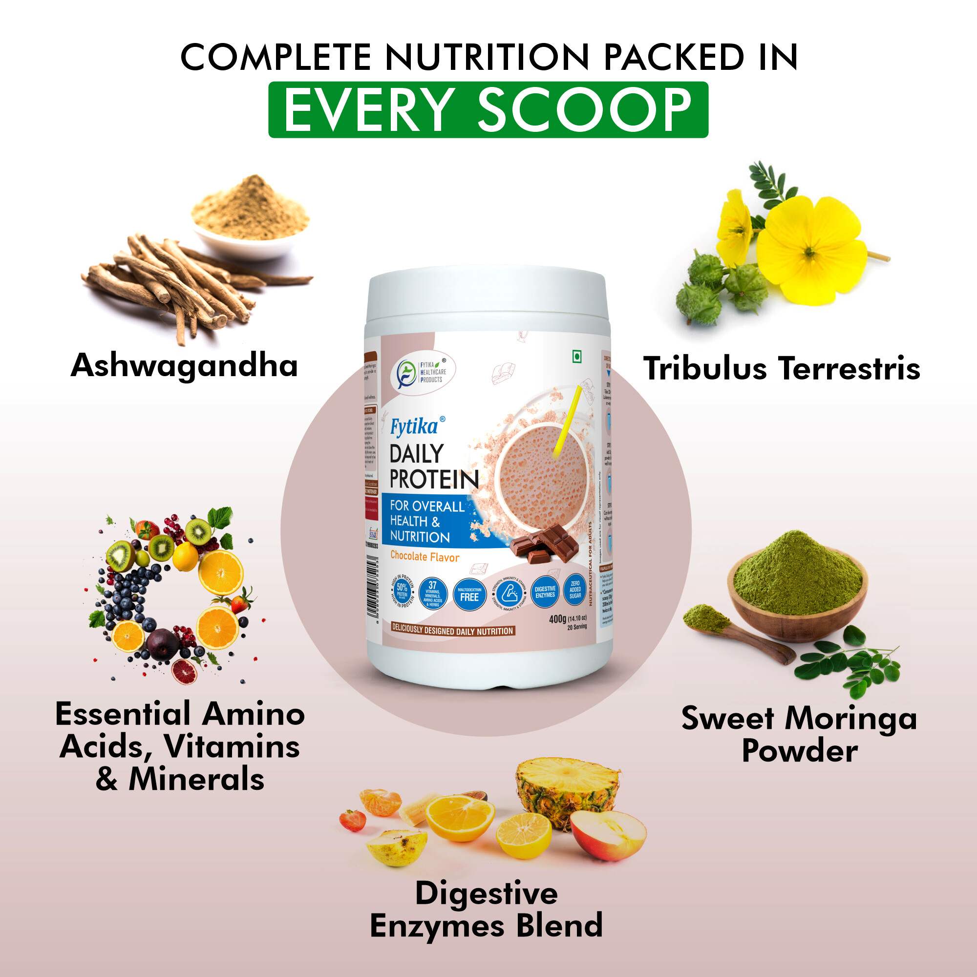 Fytika Daily Protein (Chocolate Flavor) is a premium all-in-one nutrition formula designed to support daily wellness, energy, and strength. It combines high-quality protein with 37 essential vitamins, minerals, amino acids, and Ayurvedic herbs like Ashwagandha, Sweet Moringa Powder, and Gokshura (Tribulus Terrestris). Enhanced with a blend of digestive enzymes for better nutrient absorption, this 100% natural formula helps combat lethargy, enhance immunity, increase energy levels, promote muscle strength, and support healthy weight management. With its rich chocolate flavor, Fytika Daily Protein makes staying fit, nourished, and energized a truly enjoyable daily routine.