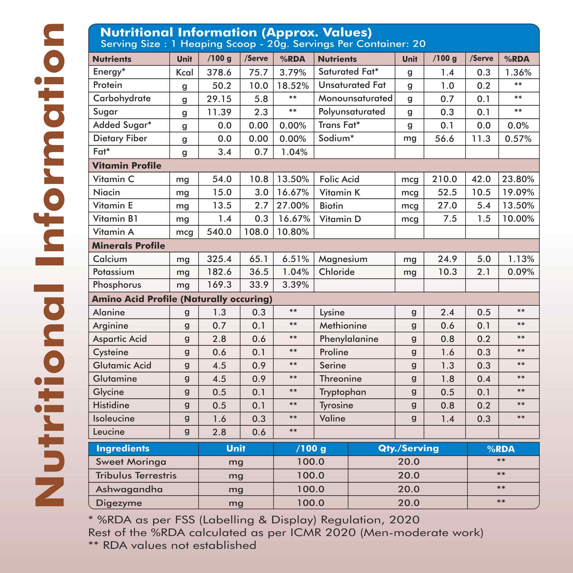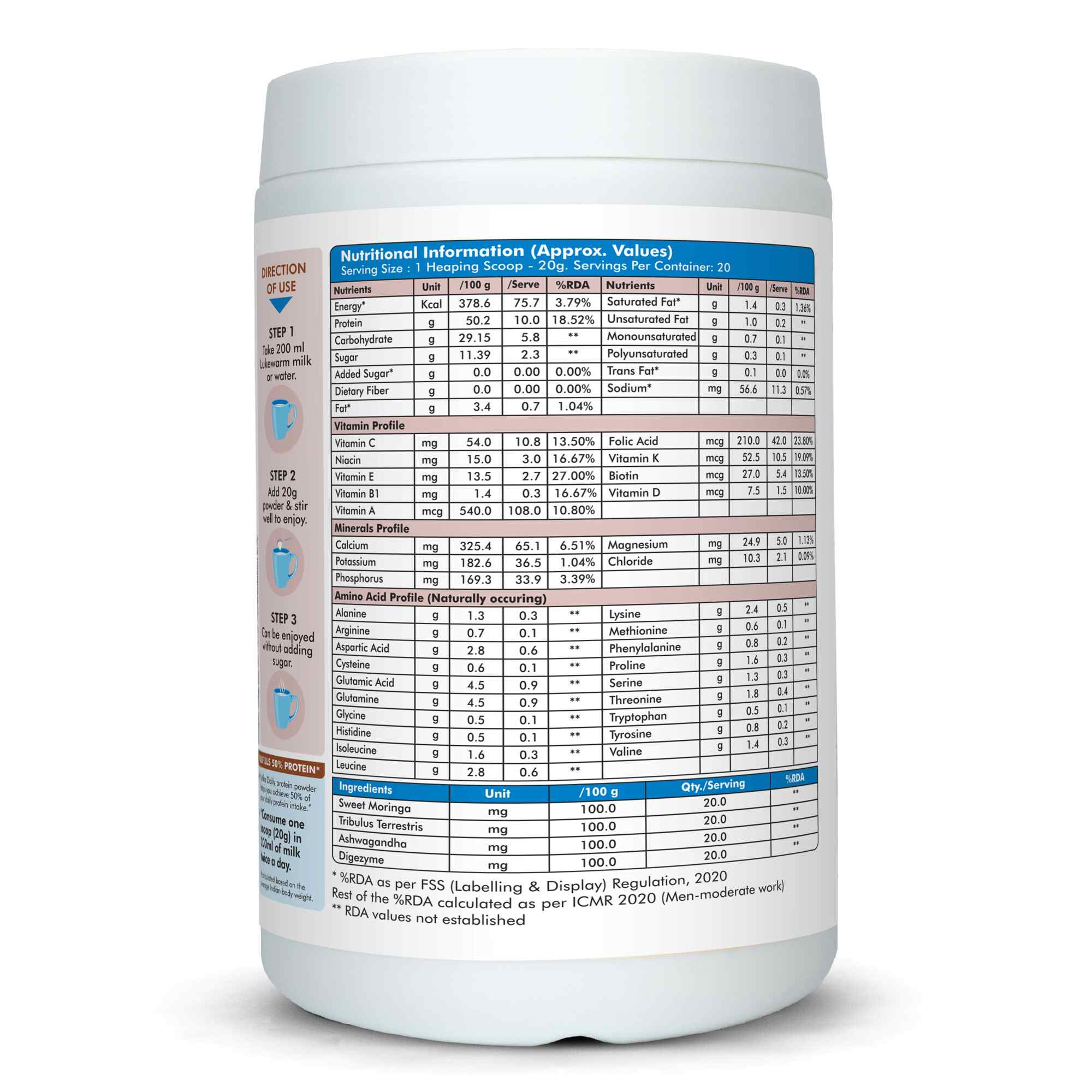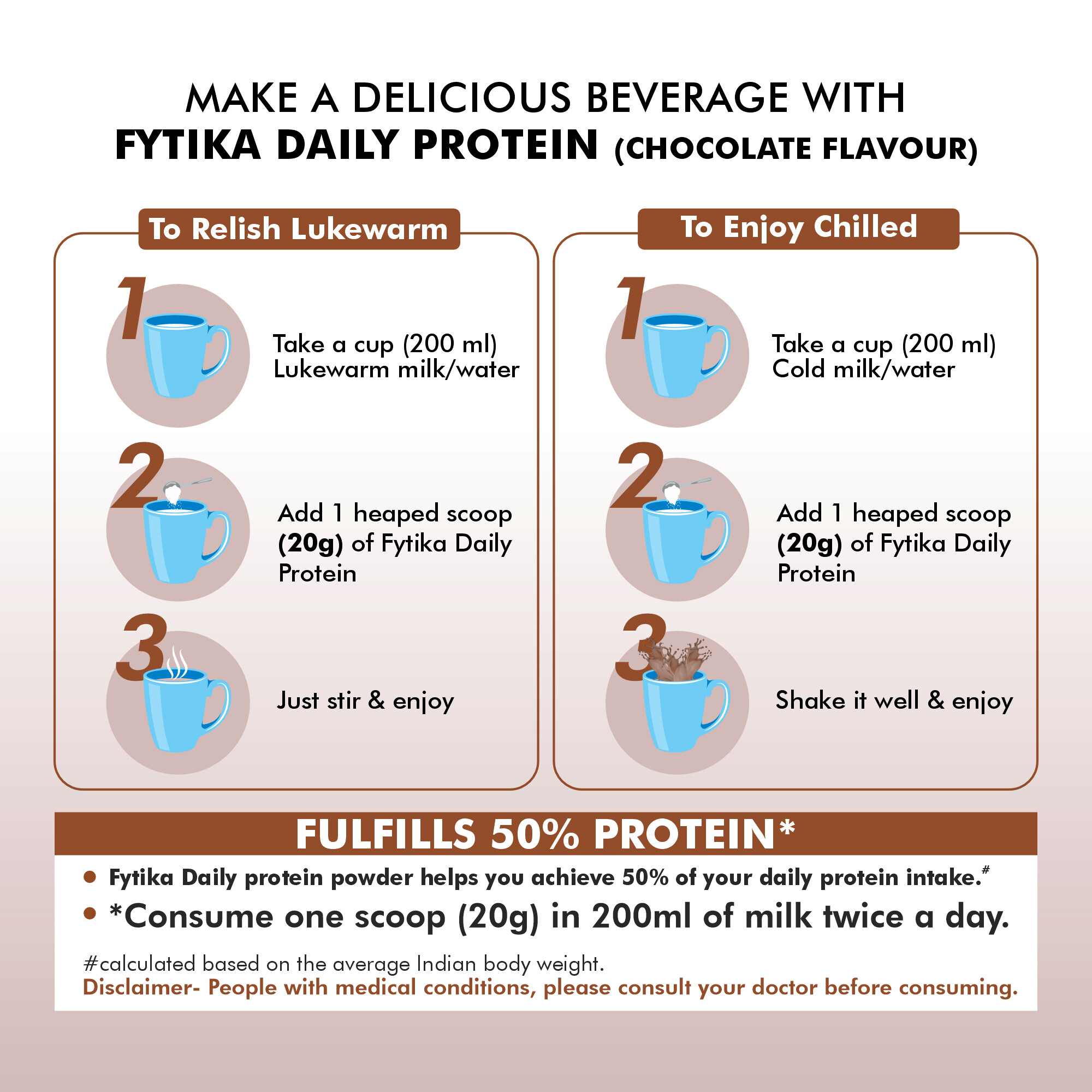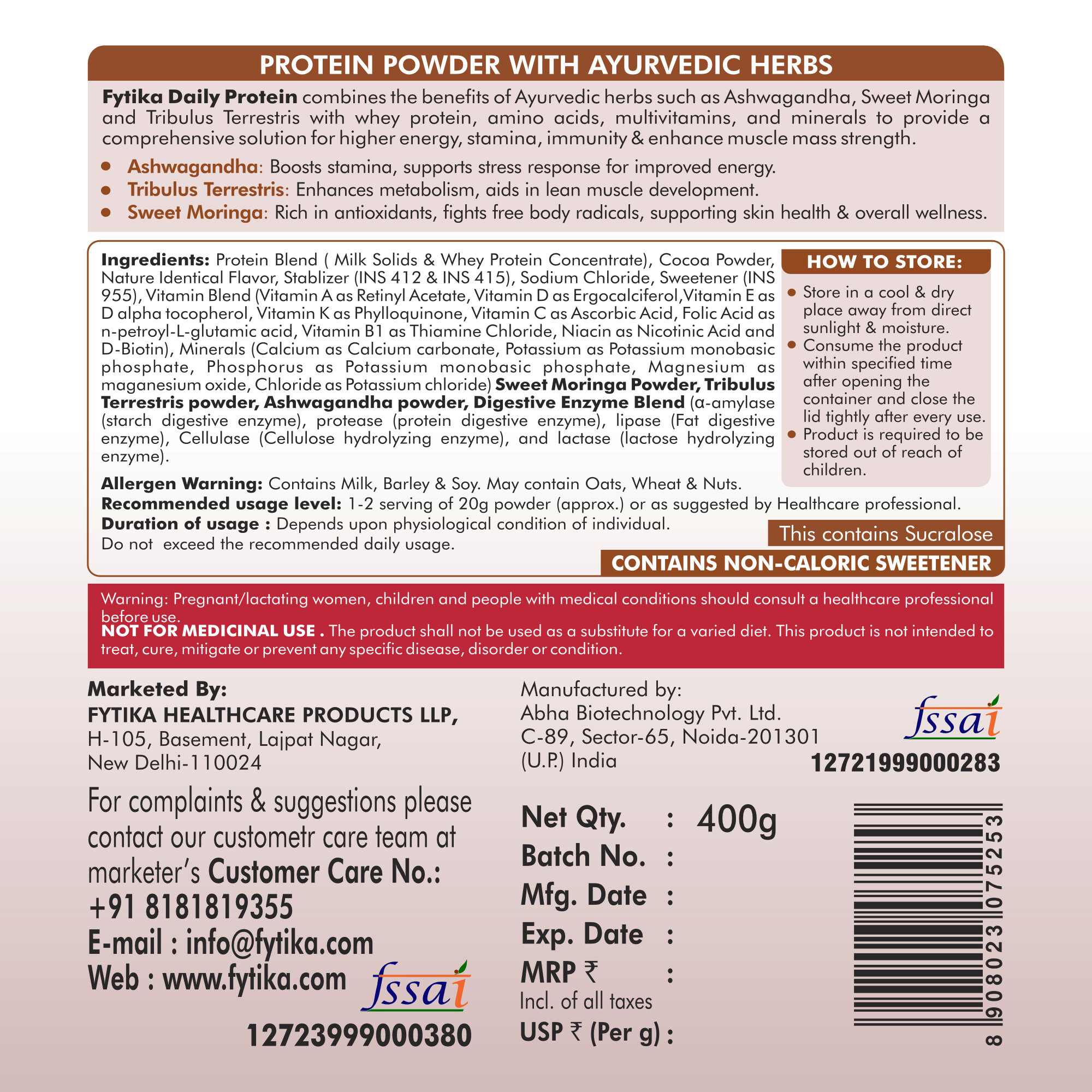Fytika Daily Protein (Chocolate Flavor) is a premium all-in-one nutrition formula designed to support daily wellness, energy, and strength. It combines high-quality protein with 37 essential vitamins, minerals, amino acids, and Ayurvedic herbs like Ashwagandha, Sweet Moringa Powder, and Gokshura (Tribulus Terrestris). Enhanced with a blend of digestive enzymes for better nutrient absorption, this 100% natural formula helps combat lethargy, enhance immunity, increase energy levels, promote muscle strength, and support healthy weight management. With its rich chocolate flavor, Fytika Daily Protein makes staying fit, nourished, and energized a truly enjoyable daily routine.