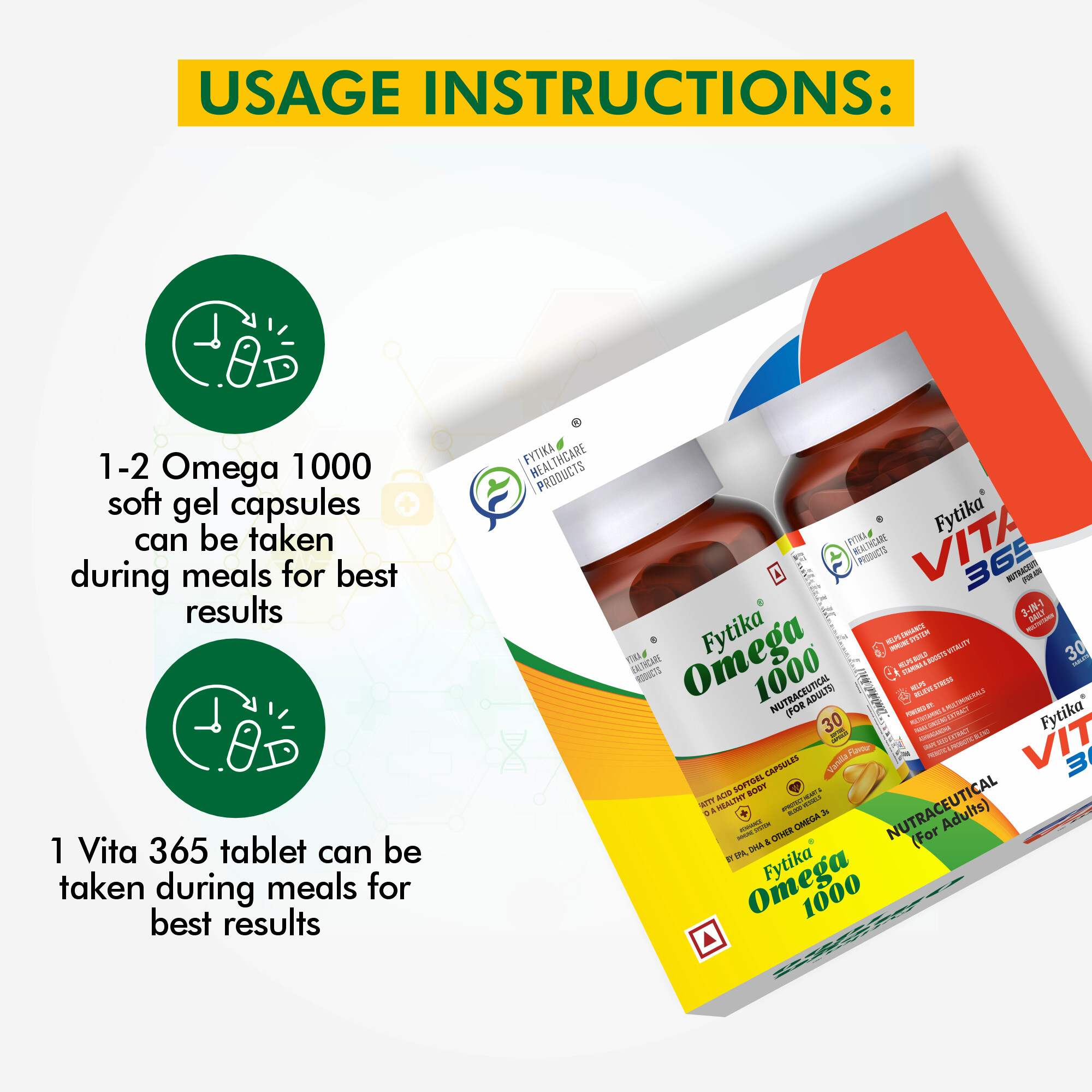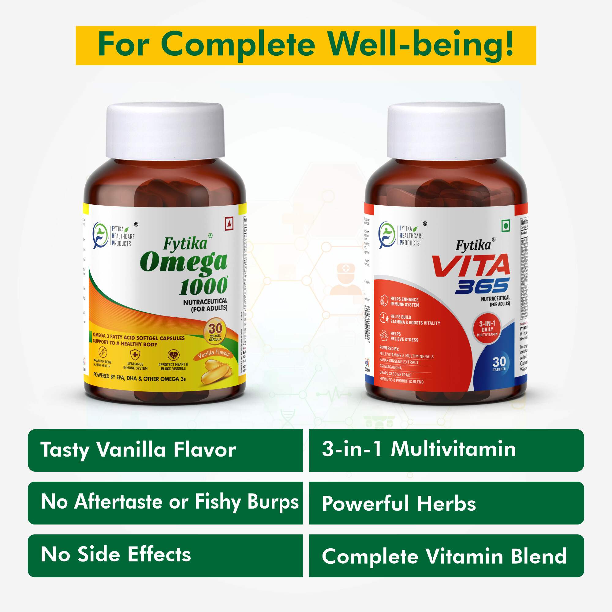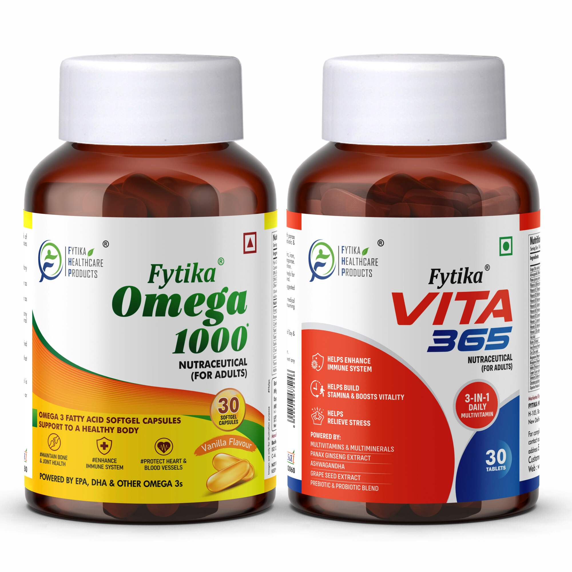 The Fytika Vita 365 + Omega 1000 Combo is a powerful wellness combination designed to nourish your body from within. Fytika Vita 365 delivers a potent multivitamin blend enriched with Vitamin D, Vitamin B12, and Zinc, boosting energy, strengthening immunity, and supporting gut health. Paired with Fytika Omega 1000, which provides 1000mg of pure Omega-3 (EPA & DHA), this combo promotes heart and brain health, maintains glowing skin, and enhances joint flexibility. Together, they form the perfect daily routine to keep you energetic, focused, and in balance—supporting total body wellness every day.