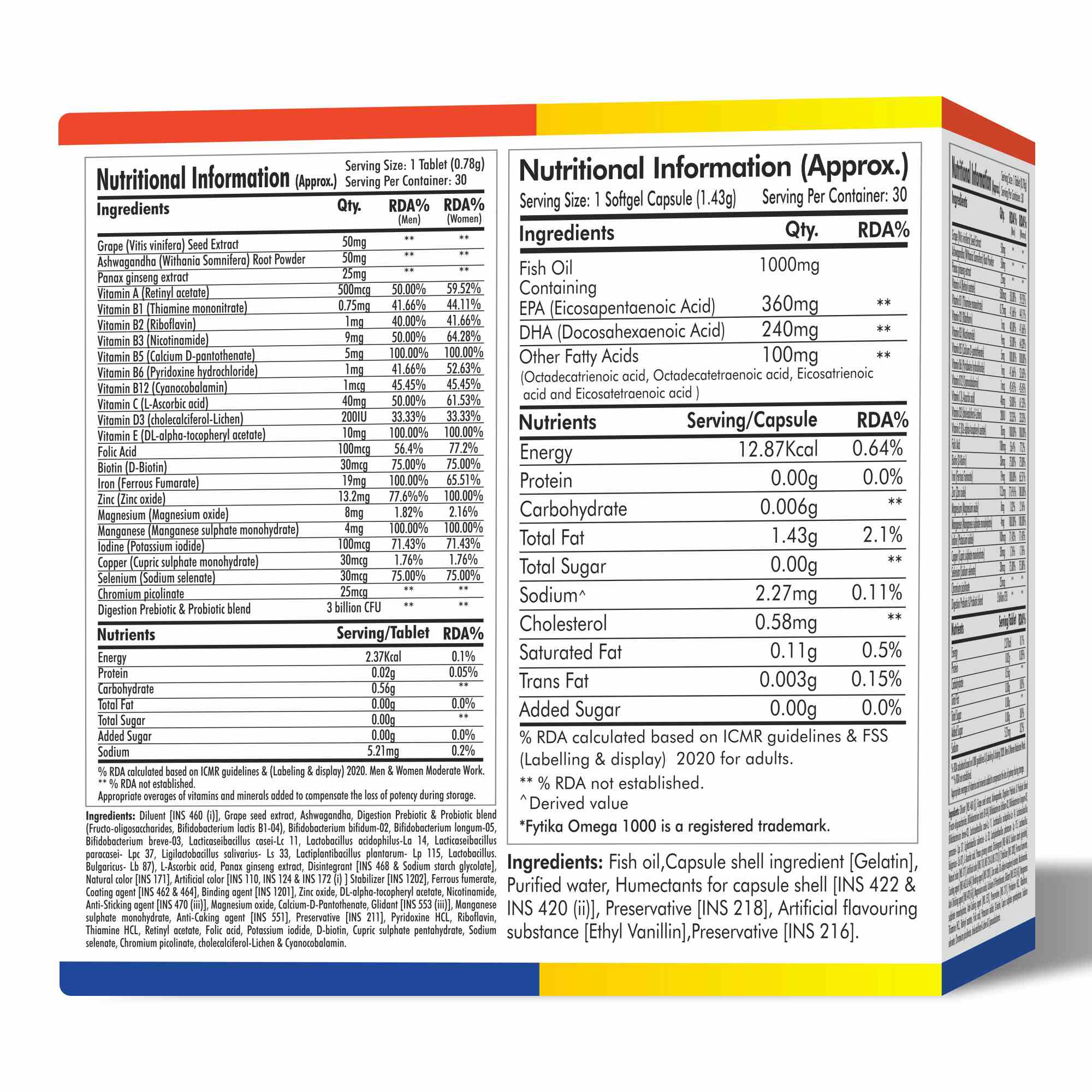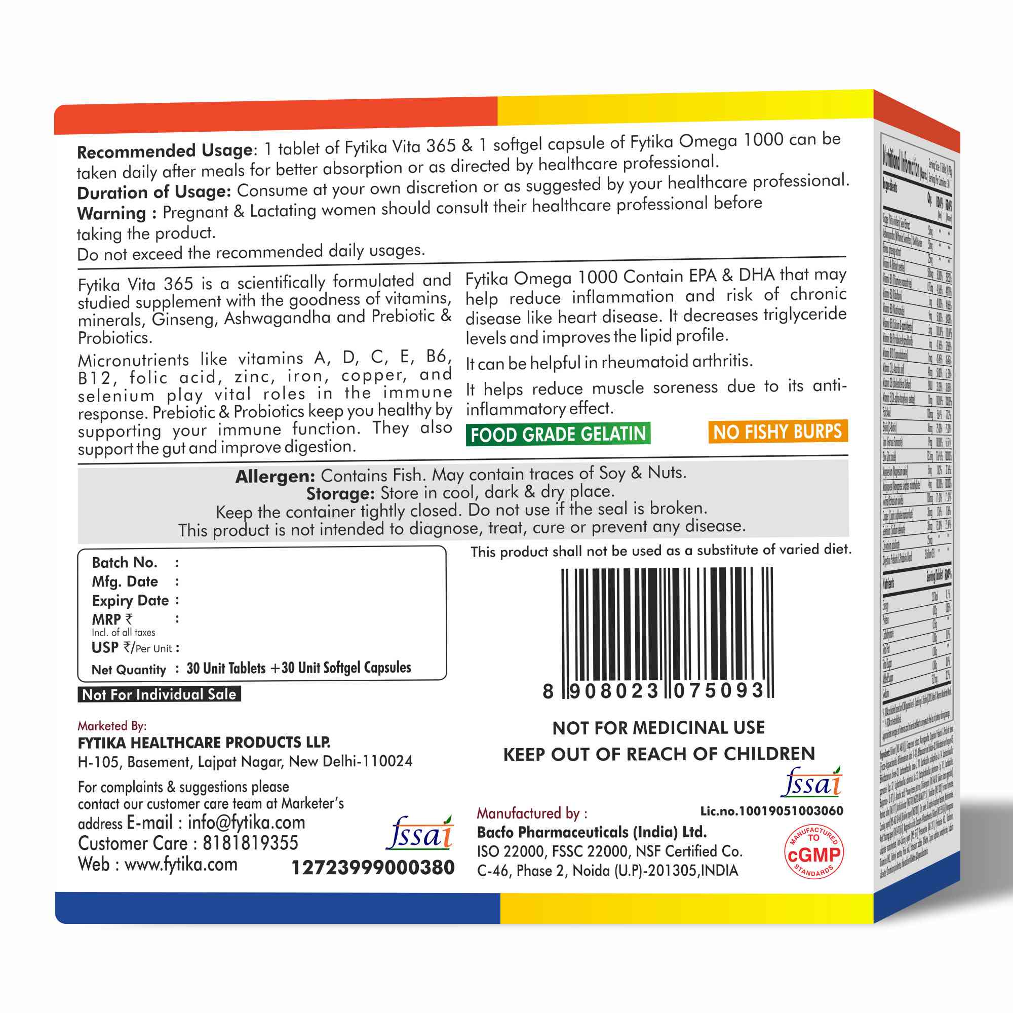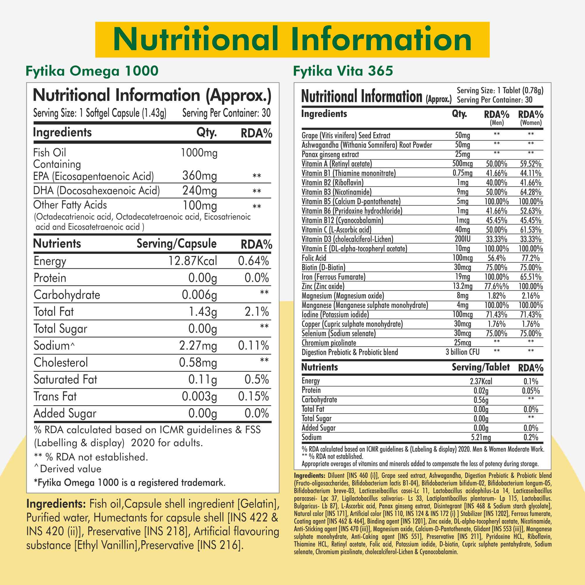 The Fytika Vita 365 + Omega 1000 Combo is a powerful wellness combination designed to nourish your body from within. Fytika Vita 365 delivers a potent multivitamin blend enriched with Vitamin D, Vitamin B12, and Zinc, boosting energy, strengthening immunity, and supporting gut health. Paired with Fytika Omega 1000, which provides 1000mg of pure Omega-3 (EPA & DHA), this combo promotes heart and brain health, maintains glowing skin, and enhances joint flexibility. Together, they form the perfect daily routine to keep you energetic, focused, and in balance—supporting total body wellness every day.