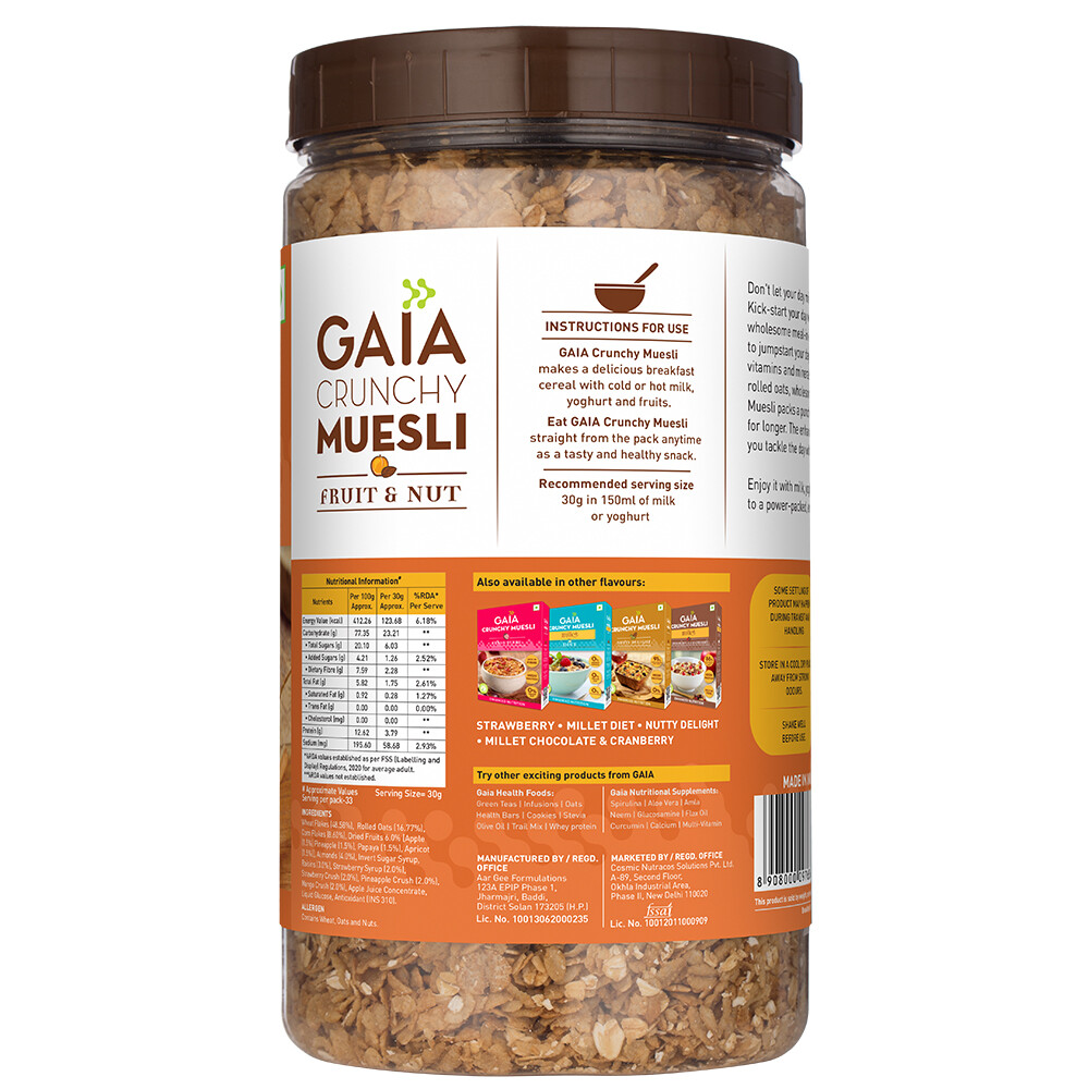 Don’t let your day miss out on a powerhouse of enhanced nutrition! Kick-start your day with GAIA Crunchy Muesli – Fruit & Nut. This wholesome meal-in-a-bowl isn’t just delicious, it’s the perfect way to jumpstart your day. And fuel your body and mind with essential vitamins and minerals. Crafted with a satisfying blend of high-fibre rolled oats, wholesome wheat, and cornflakes. GAIA Crunchy Muesli – Fruit & Nut packs a punch of dietary fibre and keeps you feeling fuller for longer. The enhanced nutrition in GAIA Crunchy Muesli helps you tackle the day with focus and clarity.