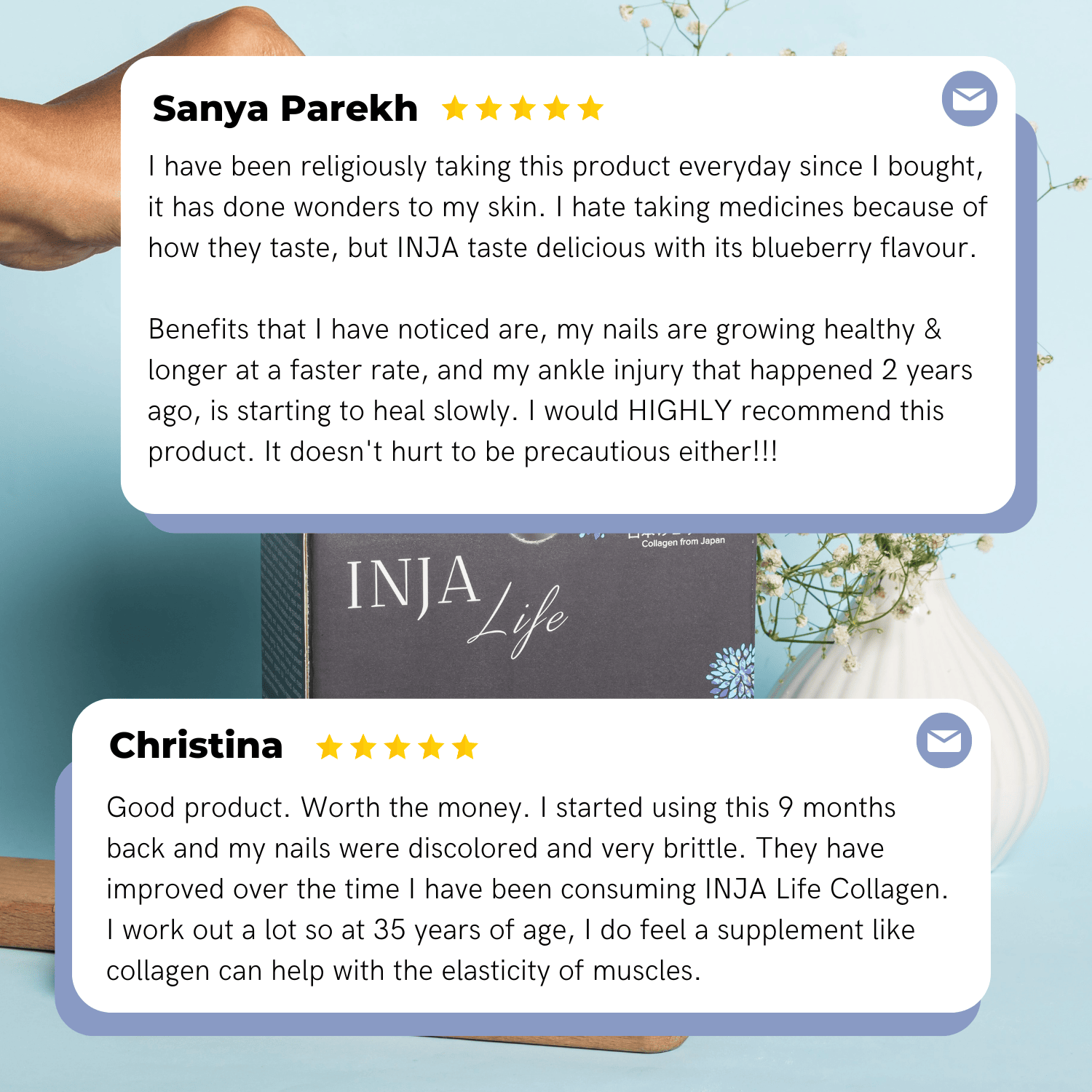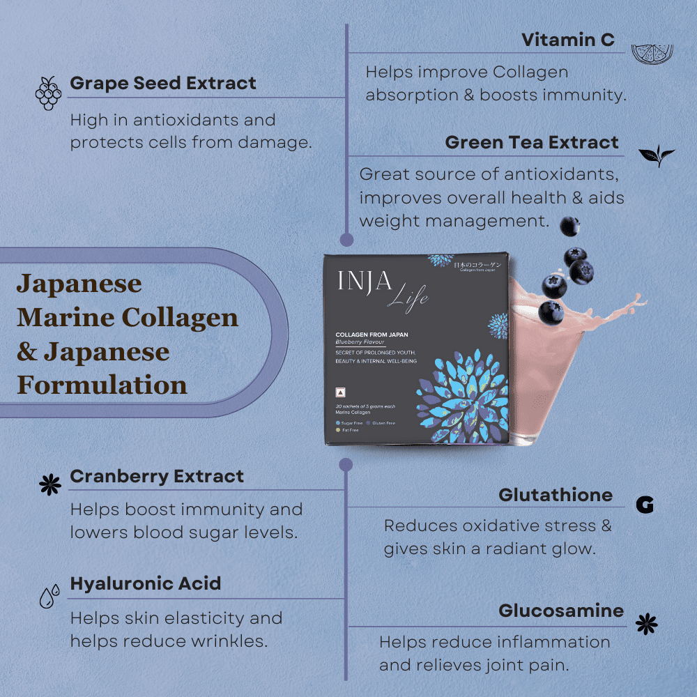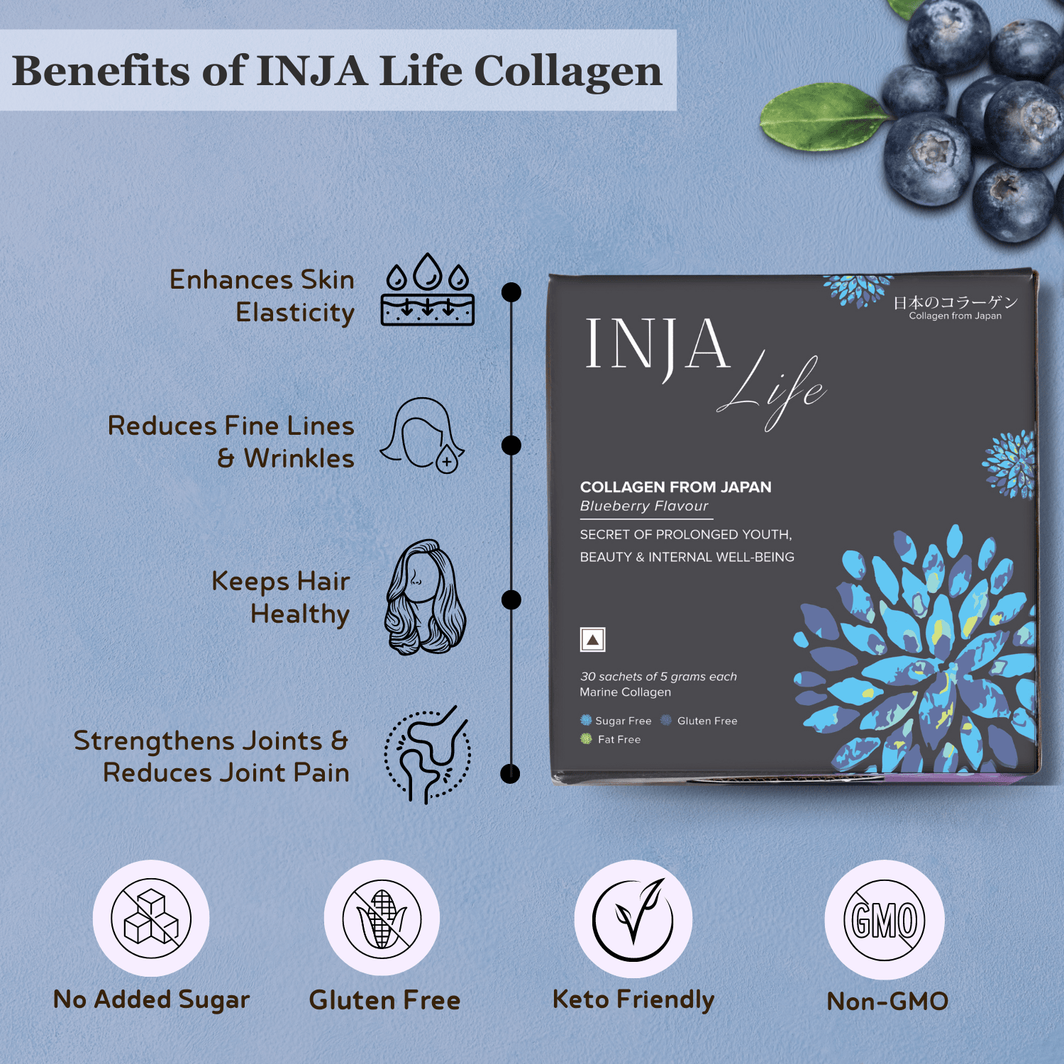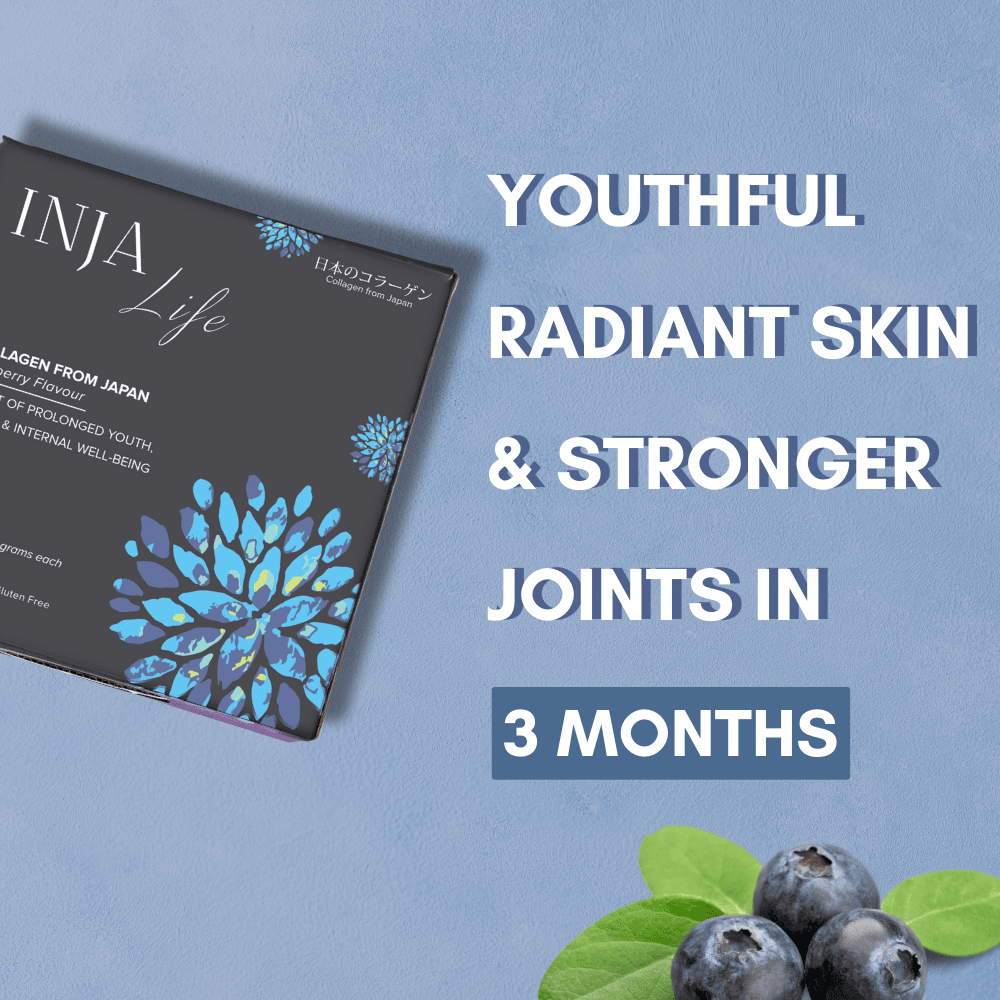INJA Life Collagen comes in a box of 30 sachets of 5 grams each (150 grams in total). It has a Blueberry Flavour to it.