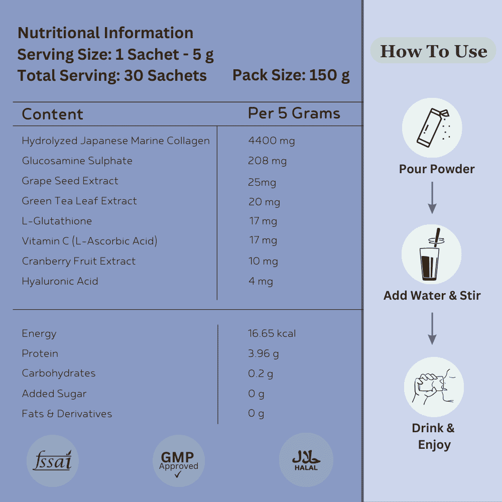 Our body naturally produces collagen but as we grow older, our body continuously slows down the production of collagen which is why we start ageing faster, internally and externally. Collagen also reduces in our bodies due to stress, tobacco, high sugar diet and over exposure to UV rays.