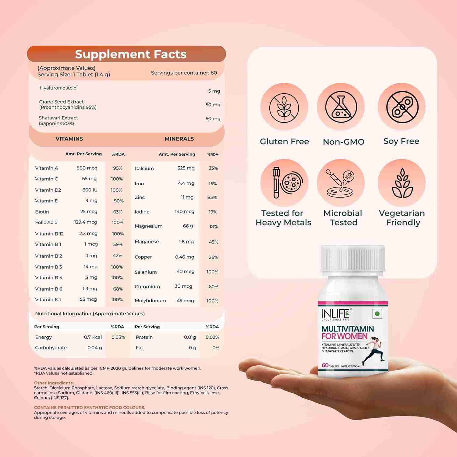 Inlife Multivitamin and Mineral Tablet for Women with Hyaluronic Acid, Grape Seed Extract (Proanthocyanidins 95%), Shatavari Extract (20% Saponins) - 13 Vitamins & 10 Minerals. Inlife Multivitamin and Mineral Tablets for Women is a meticulously crafted dietary supplement designed to support women’s daily nutritional intake.