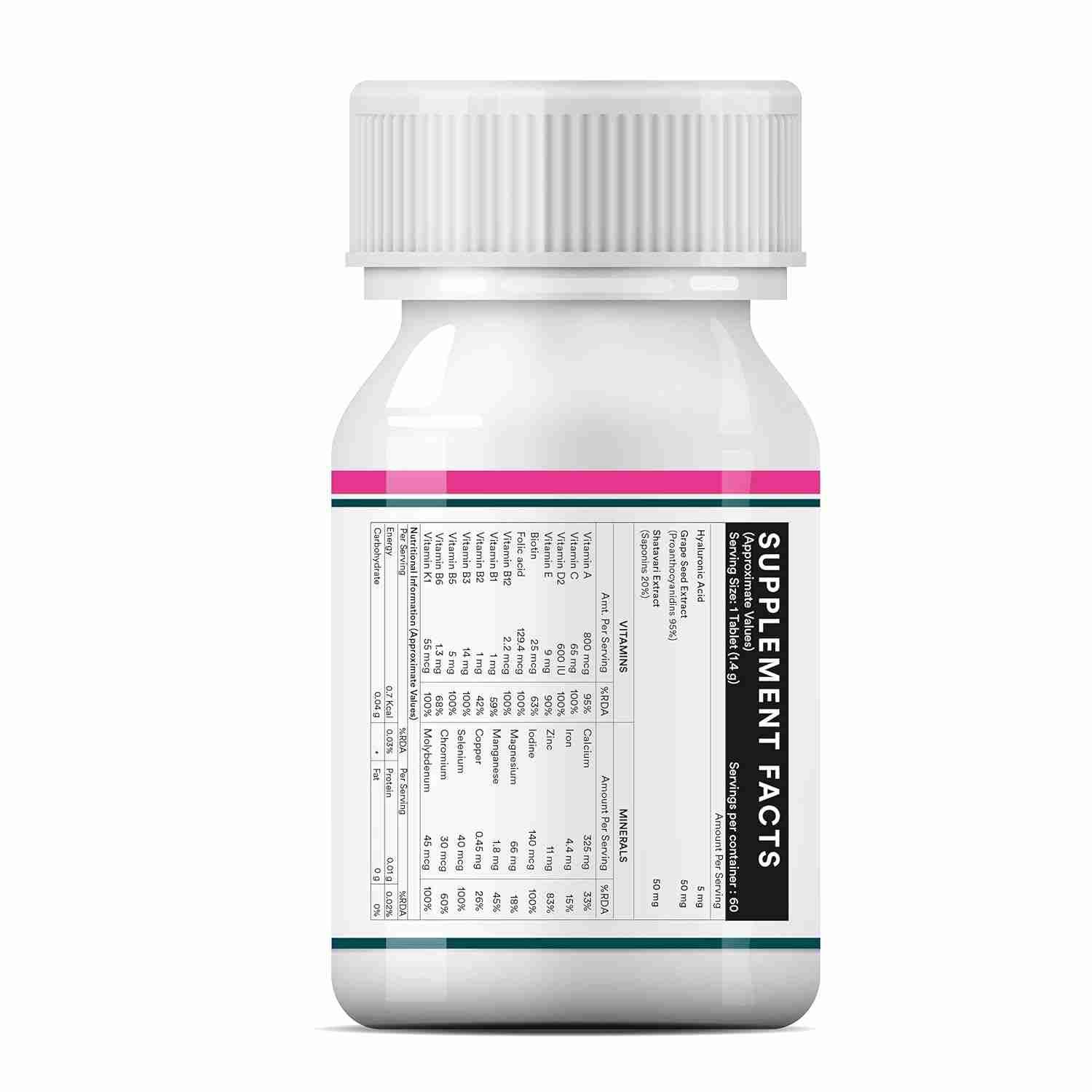 This advanced formula combines 13 essential vitamins, 10 minerals, and natural extracts like Hyaluronic Acid, Grape Seed Extract (Proanthocyanidins 95%), and Shatavari Extract (20% Saponins).