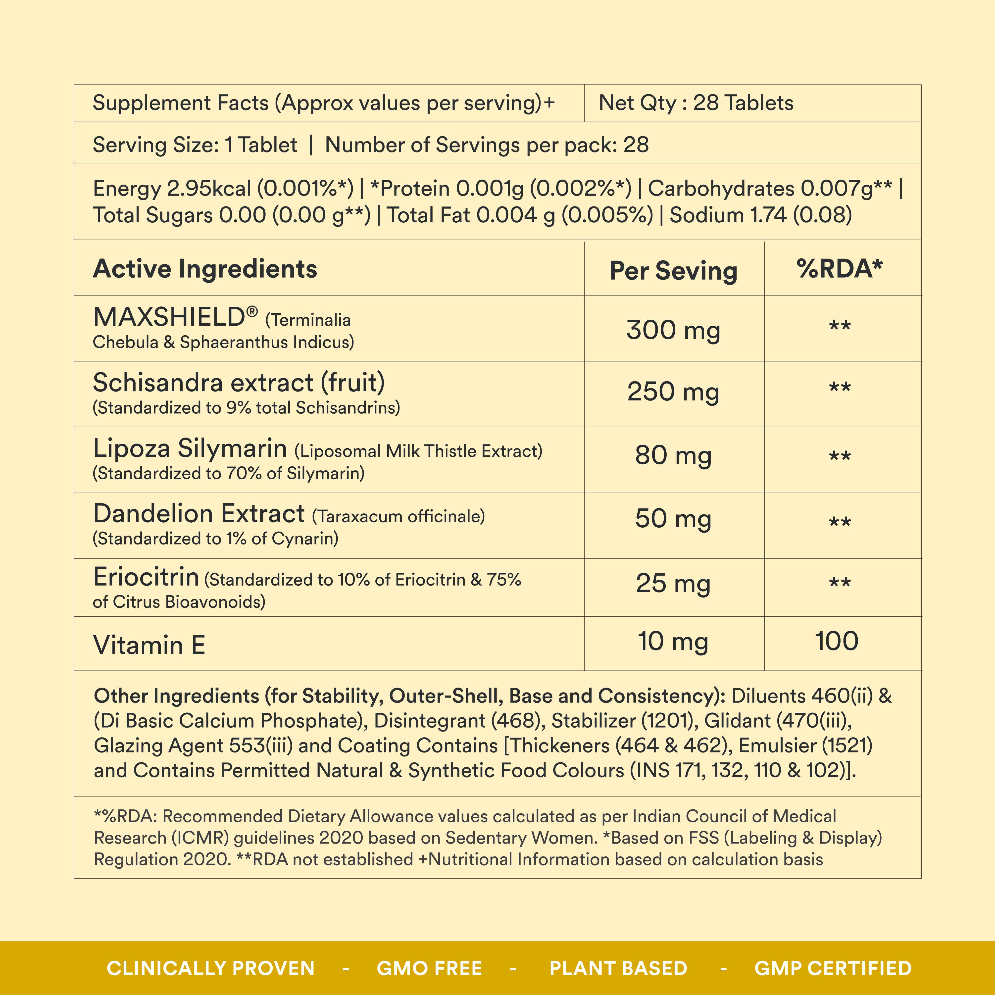• Key Ingredients : MAXSHIELD, Schisandra extract (fruit), Lipoza Silymarin, Dandelion Extract, Eriocitrin, Vitamin E, Diluents 46000& (Di Basic Calcium Phosphate), Disintegrant (468), Stabilizer (12015. Glidant (470) Glazing Agent 563) and Coating Contains [Thickeners (464 & 462), Emulsier (1521) and Contains Permitted Natural & Synthetic Food Colours (INS 171, 132, 110 & 102))