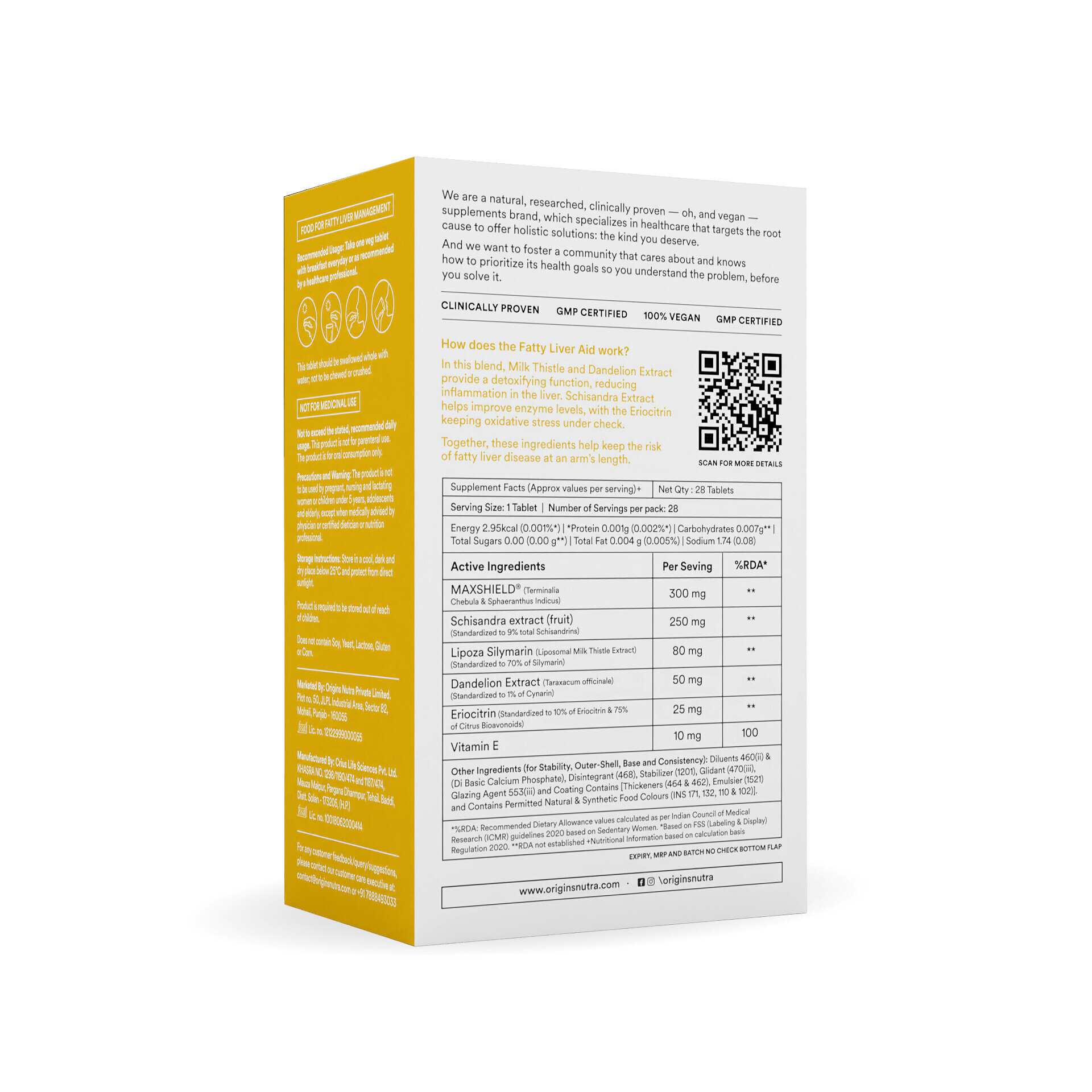 PLANT-BASED FORMULA FOR A HEALTHY LIVER FUNCTION Origins Nutra Fatty Liver Aid is a powerful, plant-based solution addressing the root causes of liver issues such as toxin accumulation, oxidative stress, and impaired function. This synergistic blend is packed with MaxShield, Dandelion Extract, Schisandra Extract, Vitamin E, Eriocitrin and Lipoza Silymarin (Liposomal Silymarin from Milk Thistle Extract) for complete liver support.ENHANCES LIVER DETOXIFICATION Dandelion Extract improves detoxification in the Liver. MaxShield blend is specifically crafted to enhance liver function in non-alcoholic, overweight adults. Schisandra Extract supports Phase I and Phase II liver metabolism, promoting detoxification and overall liver health.