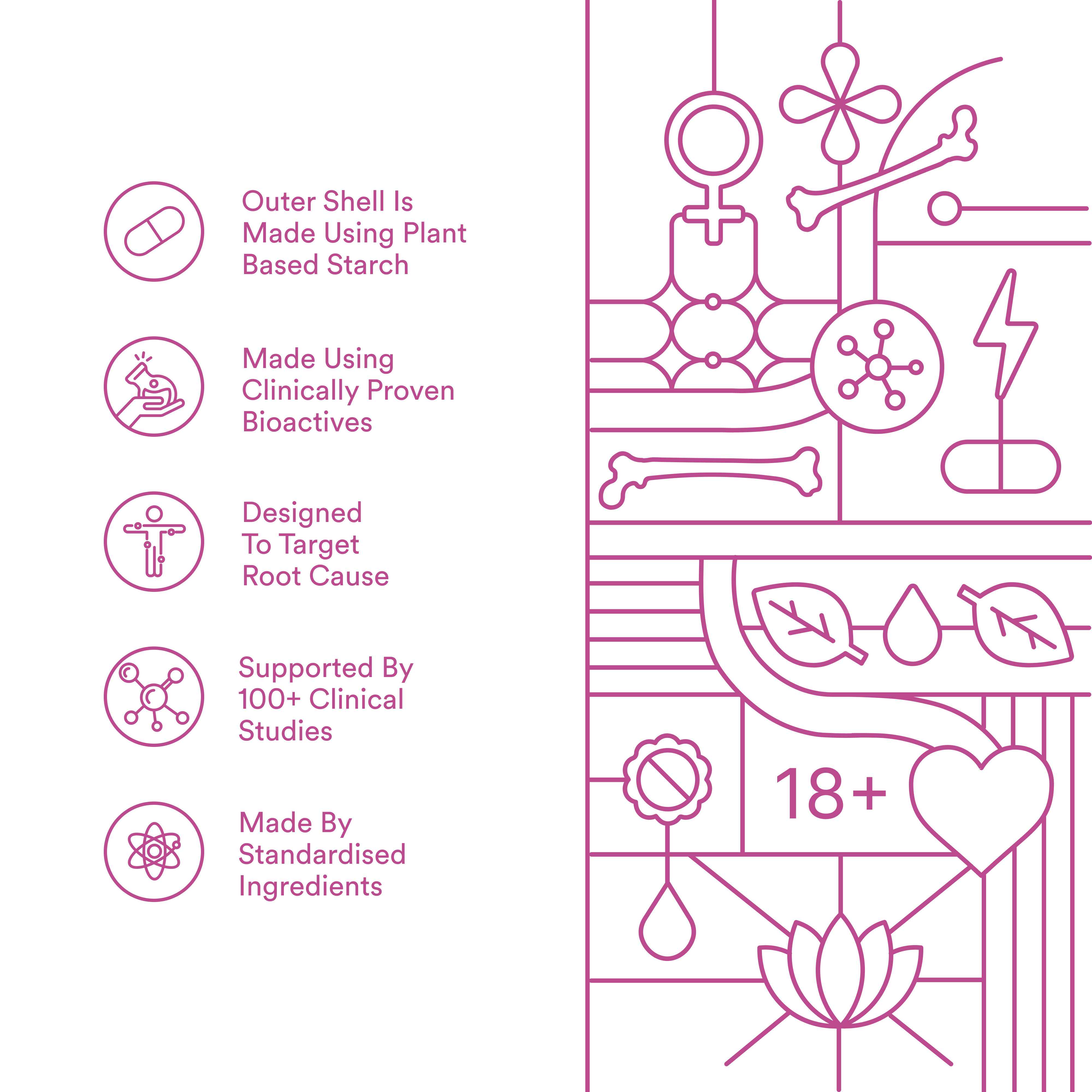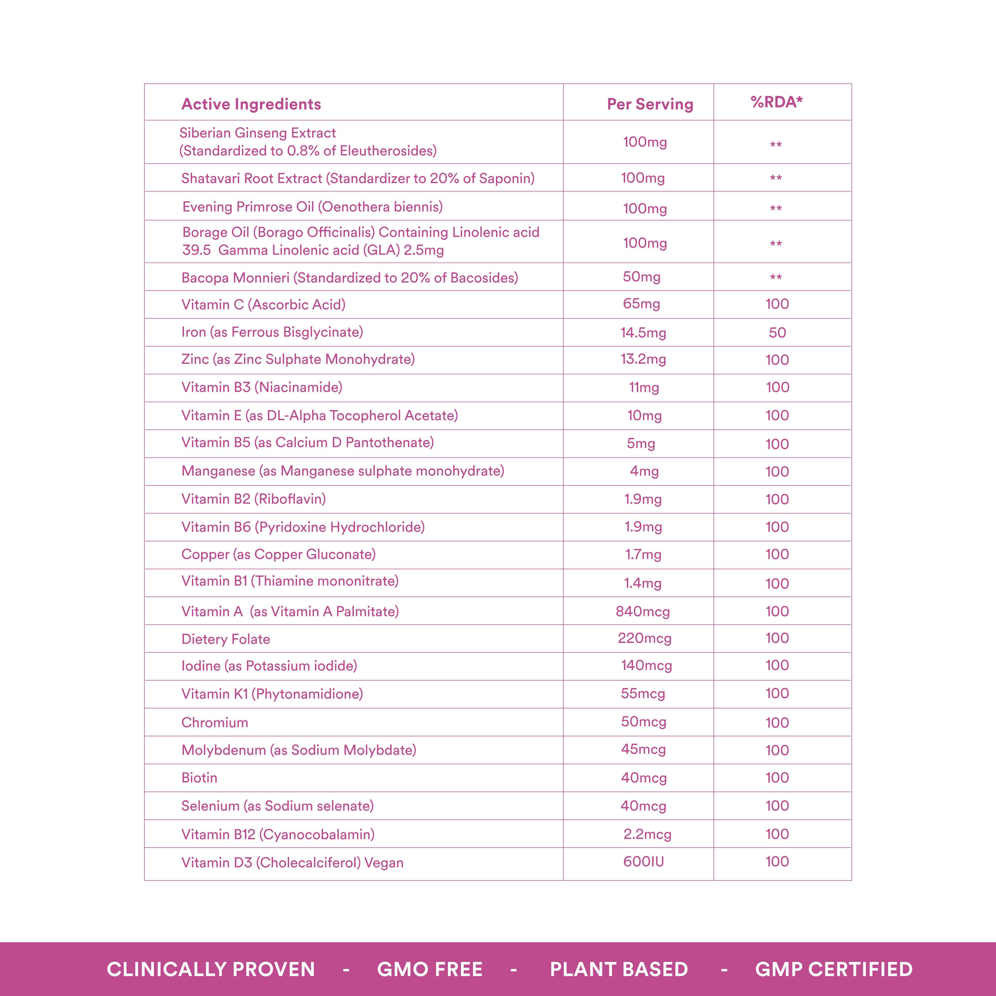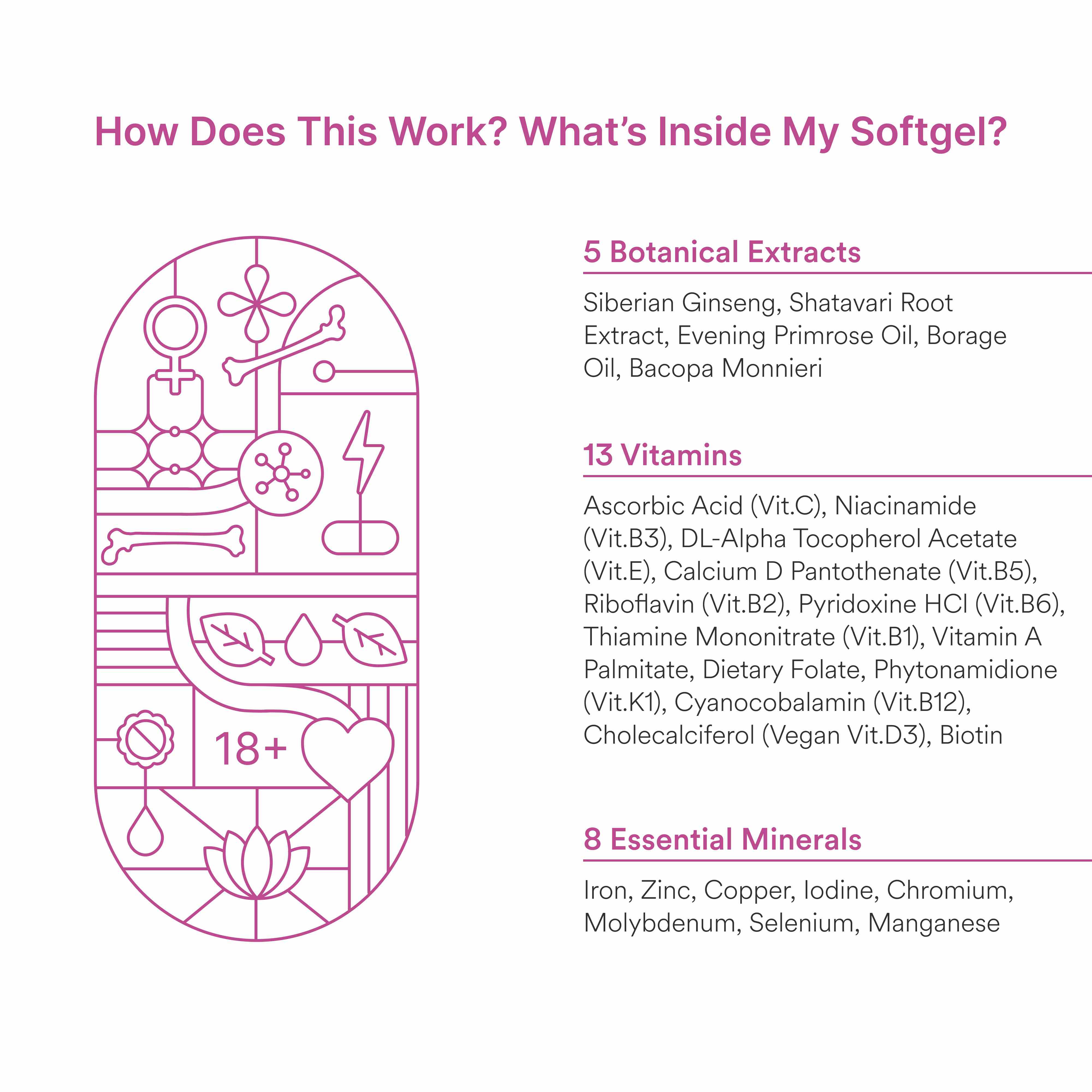 A blend of essential vitamins, minerals, and botanical extracts, specially designed for women aged 18-40 to fill nutritional gaps and ensure you thrive in your busy lifestyle. Includes Siberian ginseng and Shatavari root extract to enhance endurance and maintain daily vitality. Contains Evening Primrose Oil, Borage Oil, and Bacopa Monnieri to support hormonal balance and help manage PMS symptoms like mood swings and fatigue. Manganese, Iron and Vitamin D3 work together to support muscle function and bone strength, keeping you active and strong. Packed with immune-boosting vitamins like Vitamin C, Vitamin E, Zinc, and Selenium to strengthen your body’s natural defenses. Biotin(B7) promotes healthy skin, hair, and nails, helping you feel and look your best. Contains oil-based veg soft gels to enhance the absorption of fat-soluble vitamins, ensuring optimal bioavailability for maximum effectiveness. Made with high-quality, vegan-friendly ingredients to ensure purity, effectiveness, and overall wellness support.
