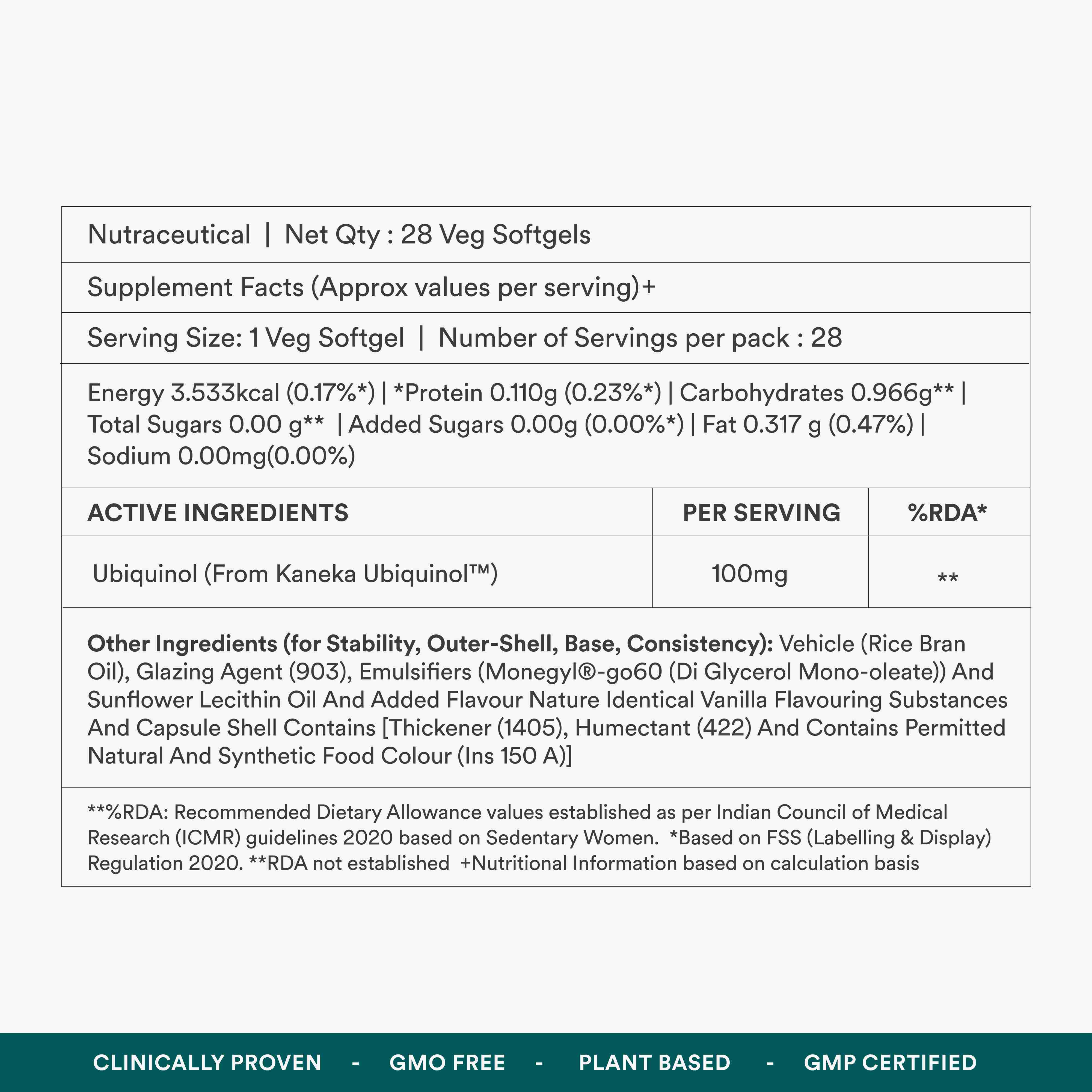 • Key Ingredients : Ubiquinol, Vehicle (Rice Bran Oil), Glazing Agent (903), Emulsifiers (Monegyl®-go60 (Di Glycerol Mono-oleate)) And Sunflower Lecithin Oil And Added Flavour Nature Identical Vanilla Flavouring Substances And Capsule Shell Contains [Thickener (1405), Humectant (422) And Contains Permitted Natural And Synthetic Food Colour (Ins 150 A)]