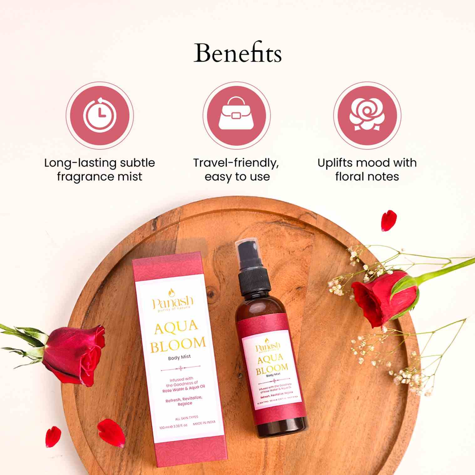 PANASH AQUA BLOOM BODY MIST is an exquisite blend designed to uplift your spirits and rejuvenate your senses. Let the calming aroma envelop you, while leaving you feel refreshed and relaxed.