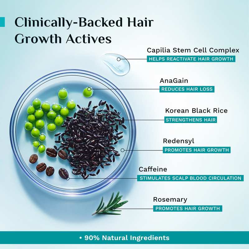 The ingredients, Redensyl and Anagain, are clinically proven to increase hair thickness & strength for longer & stronger hair. Redensyl, the breakthrough ingredient works by acting upon the hair follicles to induce new hair growth. Its regenerative properties helps with Alopecia by reducing hair loss and supporting the growth cycle. Anagain, derived from pea sprout extract stimulates new hair growth and prolongs the life cycle of the hair. It restores vitality and density for fuller, lustrous hair.