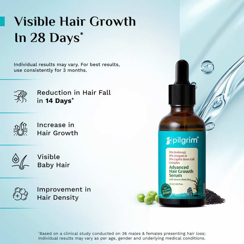 Bestselling 3% Redensyl & 4% Anagain Advanced Hair Growth Serum is now clinically tested to show new hair growth in 28 days. *Based on a clinical study conducted on 32 males & females presenting hair loss; Individual results may vary as per age, gender and underlying medical conditions.
