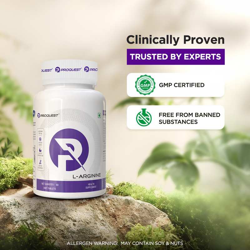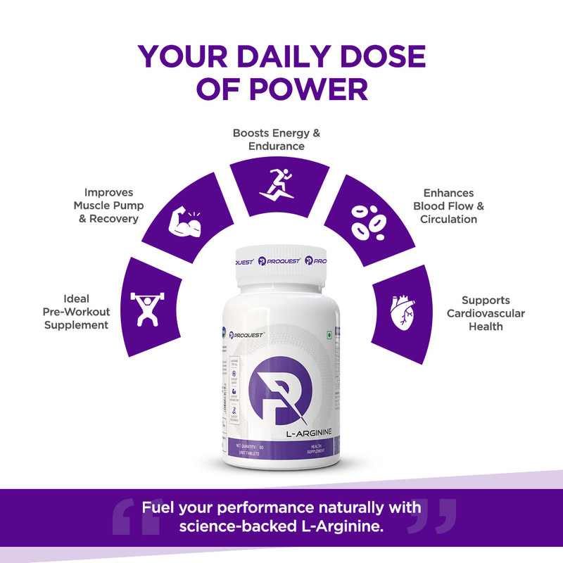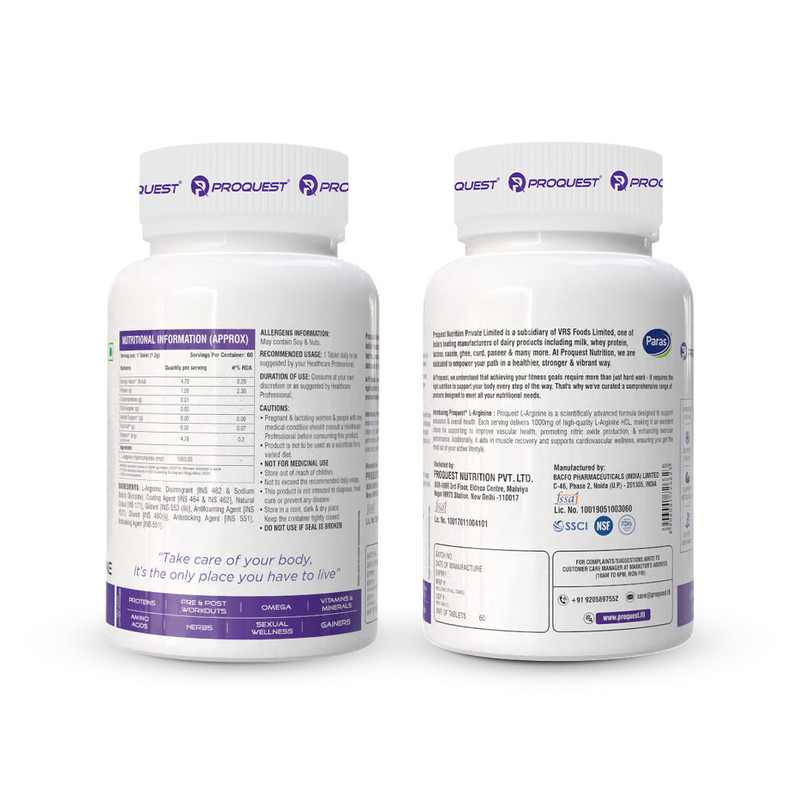 Proquest L-Arginine provides 1000 mg of L-Arginine HCL, an essential amino acid that enhances blood circulation, oxygen delivery, and muscle performance. This supplement helps boost endurance, support heart health, and promote better workout recovery. L-Arginine HCL is a key amino acid known for its high bioavailability, maximizing nitric oxide (NO) production for optimal blood flow, oxygen transport, and muscle pump. This scientifically backed formula supports muscle recovery & endurance, stamina, strength & workout performance and cardiovascular health & nitric oxide levels. Additionally, L-Arginine plays a vital role in male performance and vitality, contributing to overall wellness and circulation.