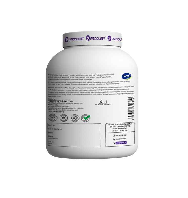 Discover the delicious and powerful benefits of our Proquest Power Whey Protein in Milk Chocolate flavor, designed to fuel your fitness journey with high-quality protein. Each serving delivers 24g of protein, providing essential nutrients for muscle support and recovery. Added Probiotics improve gut health and facilitate better absorption. In addition, the DigeZyme® that is included ensures improved digestion, which makes this protein powder an excellent option for bodybuilders, athletes, and fitness enthusiasts. With zero added sugar, our whey protein concentrate offers a pure and clean protein source, free from unnecessary additives. Certified by GMP and ISO standards and free from banned substances. Whether you are a bodybuilder, athlete, or fitness enthusiast, our whey protein is perfect for pre-workout, post-workout, or as an intra-workout supplement, providing optimal nutrition and supporting muscle recovery and performance. Additionally, it aids in weight management by reducing hunger and promoting a feeling of fullness. Boost your immune system, enhance exercise recovery, and achieve your fitness goals with our Power Whey Protein. Ideal for all – men, women, elderly, athletes, bodybuilders, and fitness enthusiasts.