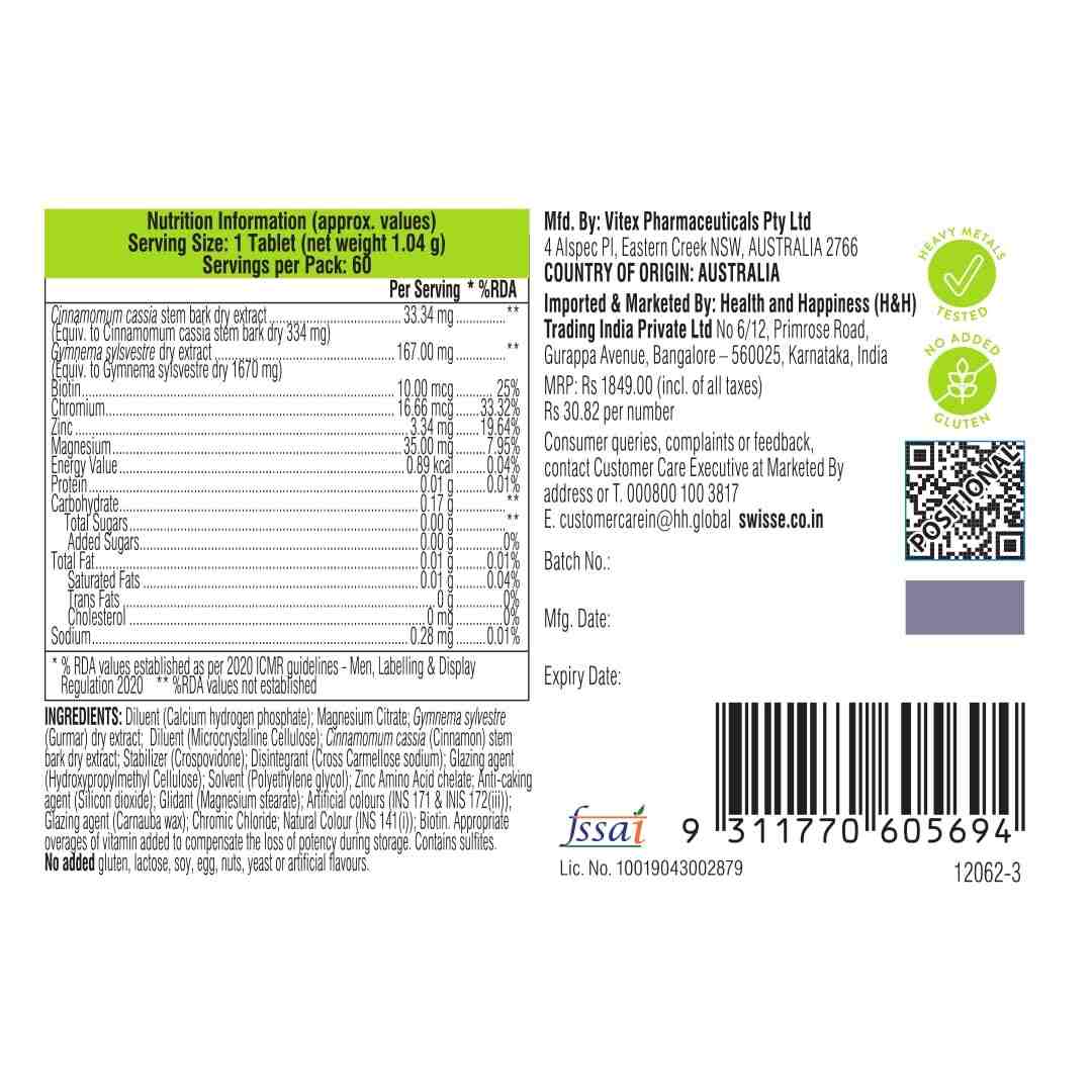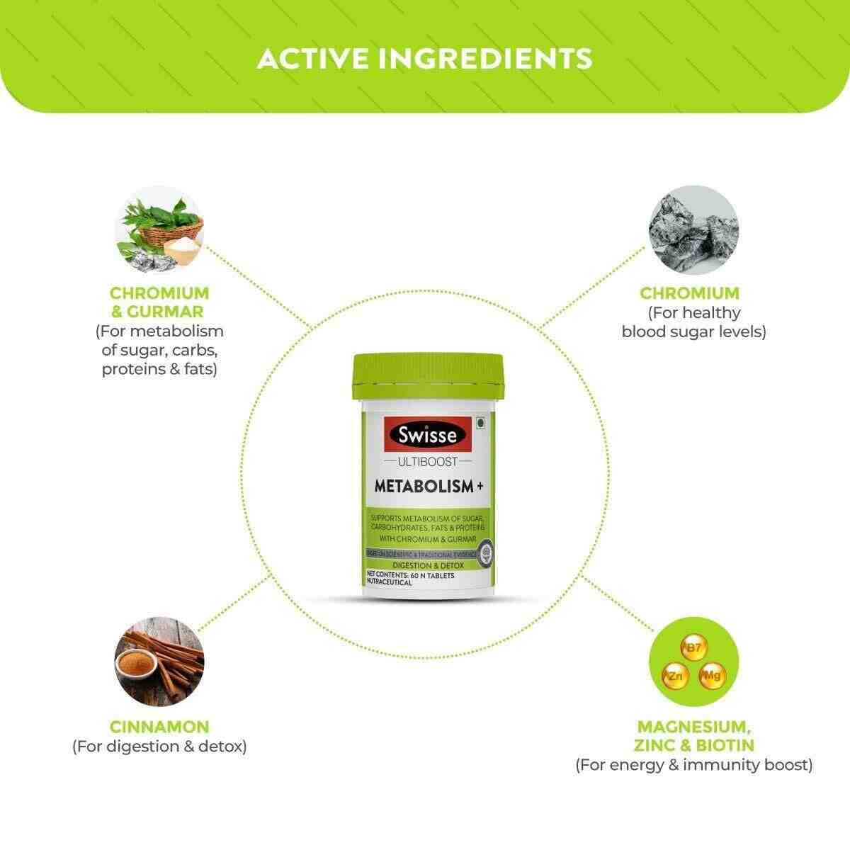 Swisse Ultiboost Metabolism+ features Gurmar Leaf Extract and Cinnamon Bark Extract. These natural ingredients contribute to the overall benefits of the product.