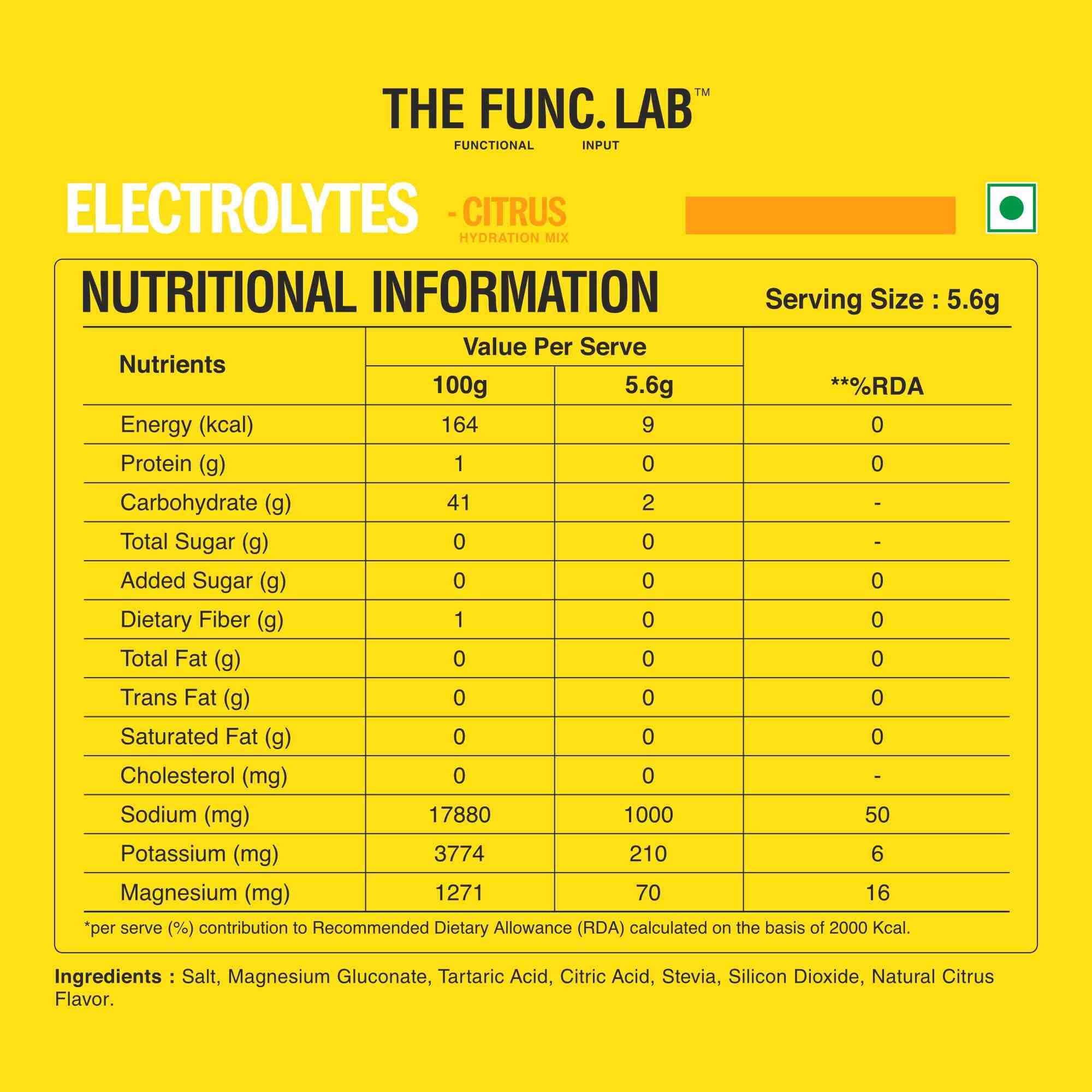 Each 5.6g sachet contains 1,000 mg of sodium, which is 50% of the Indian RDA. This makes it ideal for replenishing after sweat loss, workouts, or travel.