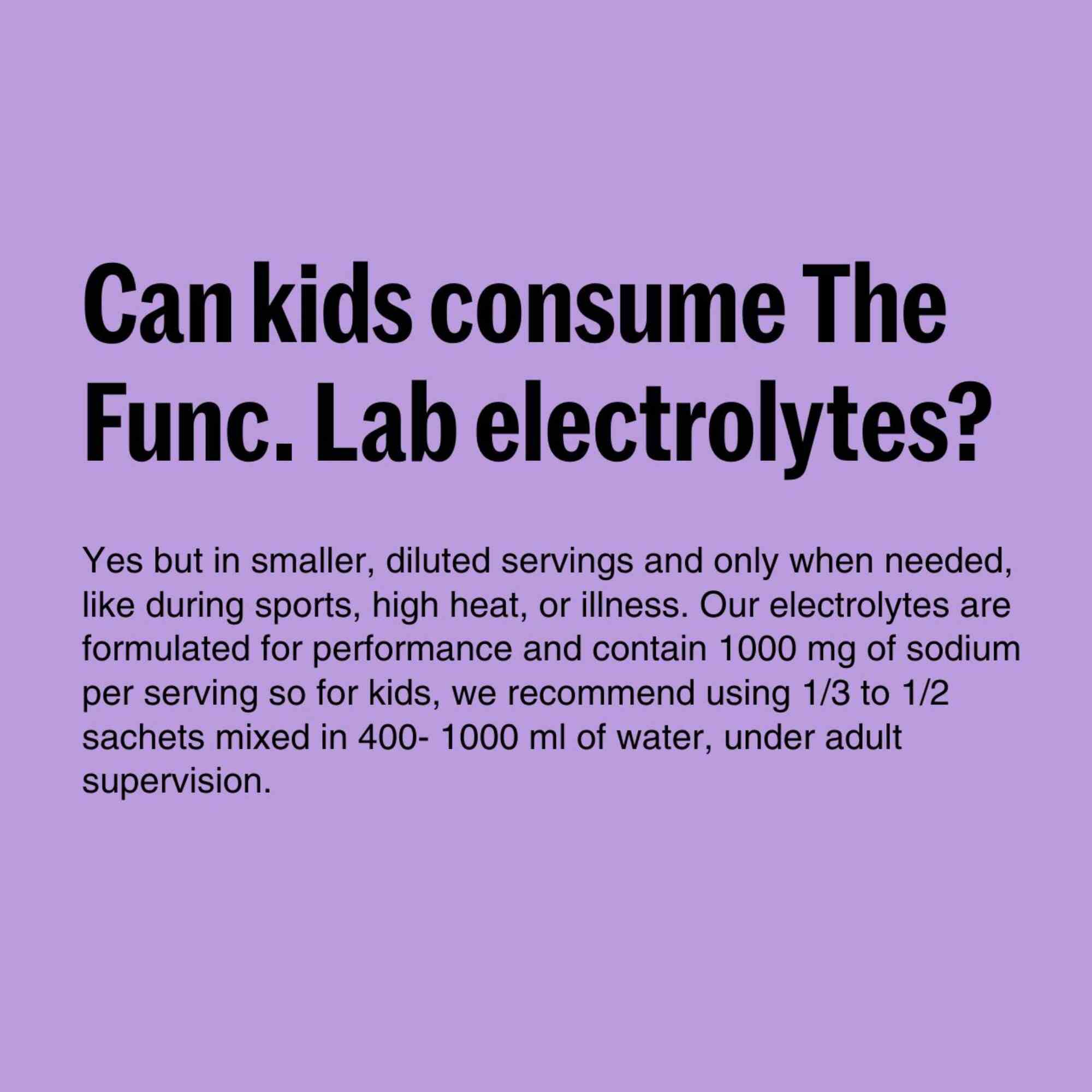 Yes but in smaller, diluted servings and only when needed, like during sports, high heat, or illness. Our electrolytes are formulated for performance and contain 1000 mg of sodium per serving so for kids, we recommend using 1/3 to 1/2 sachets mixed in 400- 1000 ml of water, under adult supervision.